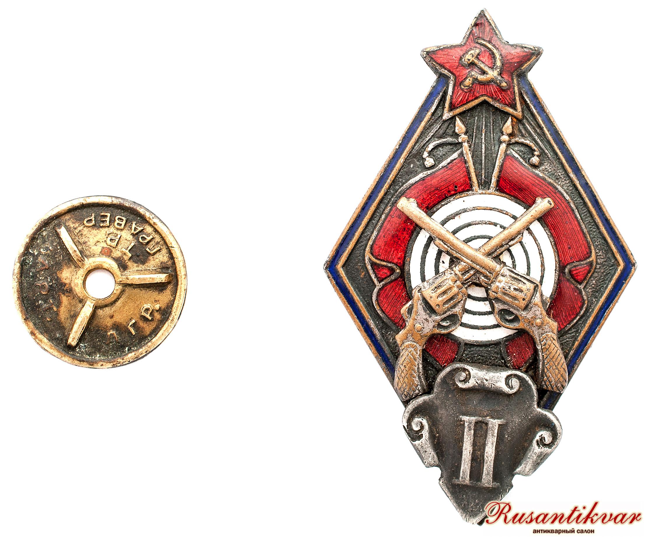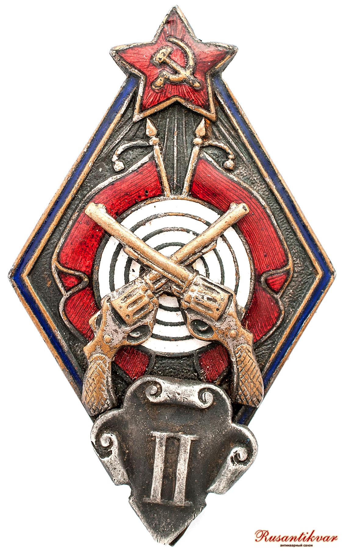 Знак за сдачу норм полевой классификации по стрельбе в погранохране, войсках и органах ОГПУ и в ПСО «Динамо» из револьвера, II класса. СССР, Москва, 1930-е гг.
