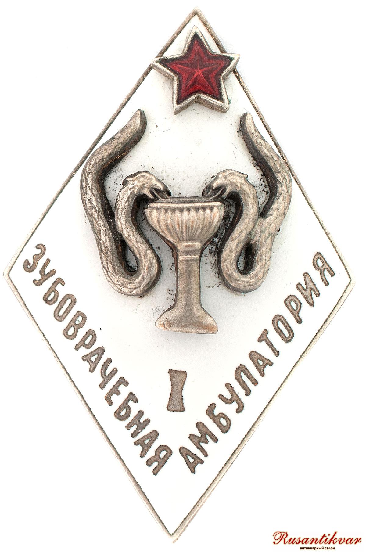 Знак Первой экспериментальной зубоврачебной амбулатории РККА. 1920-е — 1930-е гг. Неизвестная мастерская. Бронза, позолота, эмаль,винт