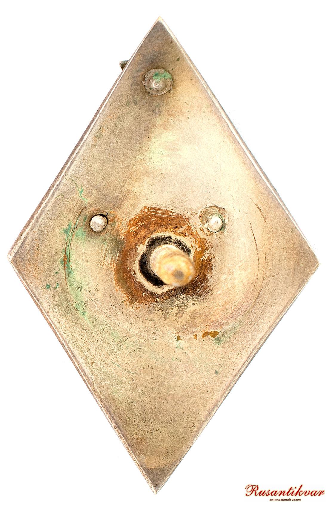 СССР, Ленинград, конец 1920-х — начало 1930-х гг. Неизвестная мастерская, клеймо «ПЭ». Клейма: на оборотной стороне знака под винтом слева — Ленинградского окружного пробирного управления с пробой металла в овальном щитке [916, голова рабочего, вправо, альфа], круглый знак удостоверения и именное клеймо «ПЭ»; на подложке и на гайке — проба металла «916». Серебро, позолота, эмаль, 26,50 г. Размеры 50,0×52,5 мм.