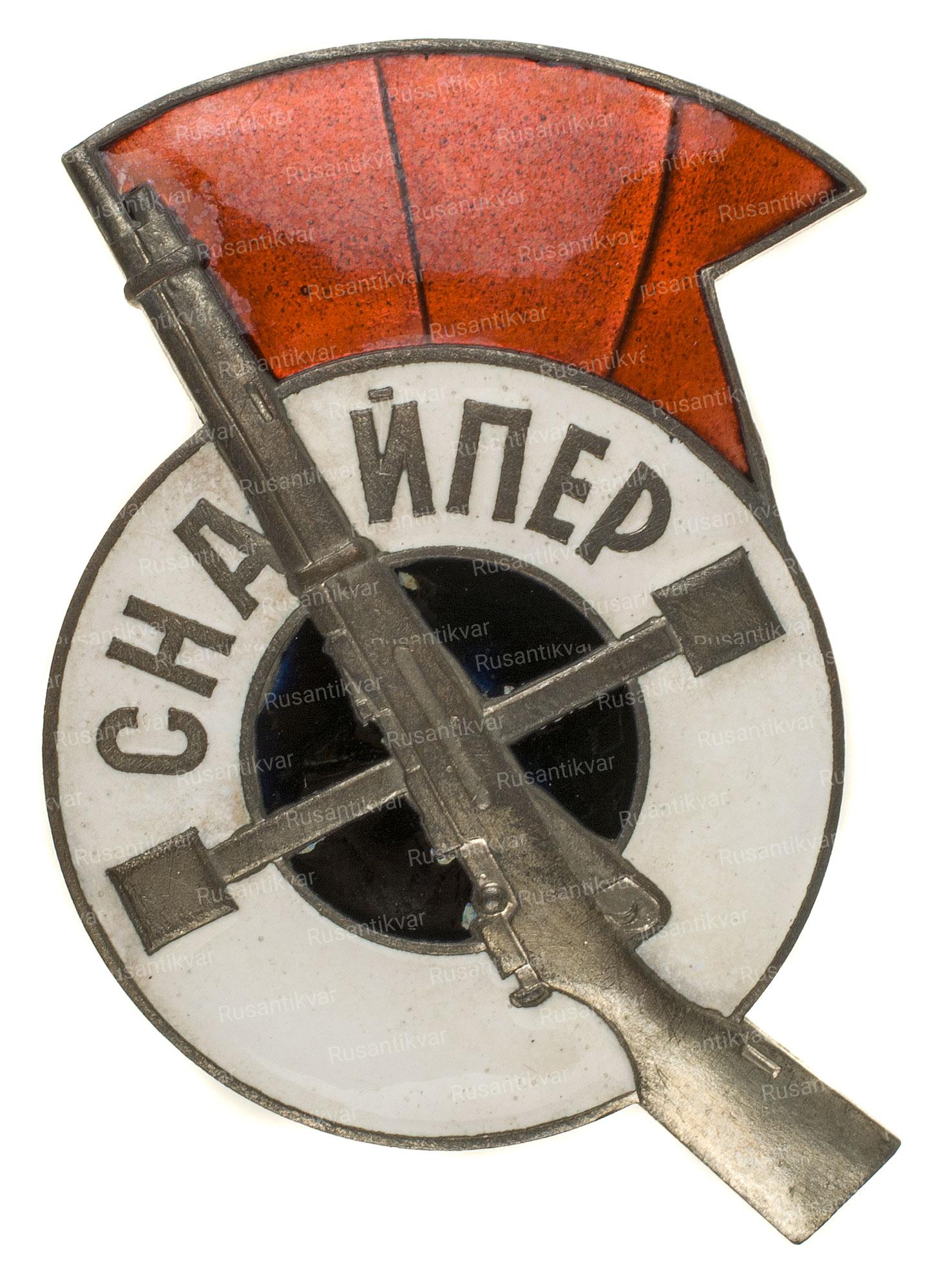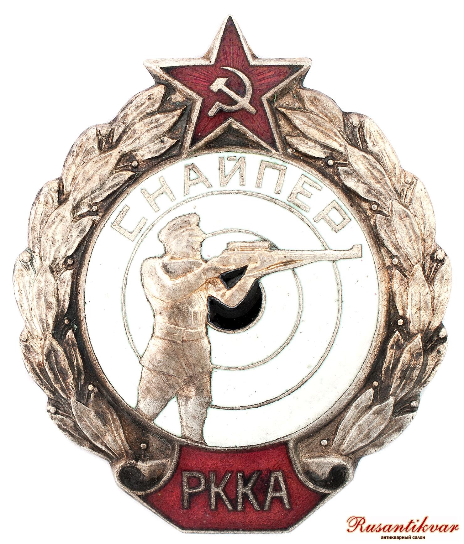 Размер 44х37 мм. Знак «Снайпер РККА» был учрежден приказом НКО СССР № 2 от 10 января 1938 г. согласно Положению «О подготовке снайперов в стрелковых частях РККА». В соответствии с этим Положением среди красноармейцев и младшего командного состава проводился набор на курсы для подготовки снайперов для стрелковых частей РККА. По окончании курсов приказом командующего военным округом, либо приказом НКО (для среднего и старшего командного и начальствующего состава) вручался знак «Снайпер РККА». После начала Великой Отечественной войны вручение знаков было отменено. Всего было выпущено 141209 знаков.