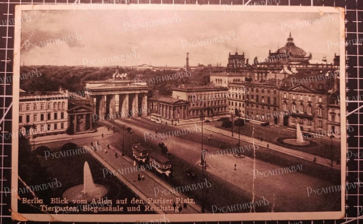 Трофейная открытка в прямом смысле этого слова: на ней изображена фотография Паризер-плаца(площади в центре Берлина), двухэтажные автобусы, фонтанчики, мирно гуляющие прохожие.. За Бранденбургскими воротами утопают в зелени липы бульвара Унтер-ден-Лидена, над ними возвышается купол Рейхстага - ещё целого, не разрушенного войной. На пожелтевшем картоне выведено послание родным перьевой ручкой: