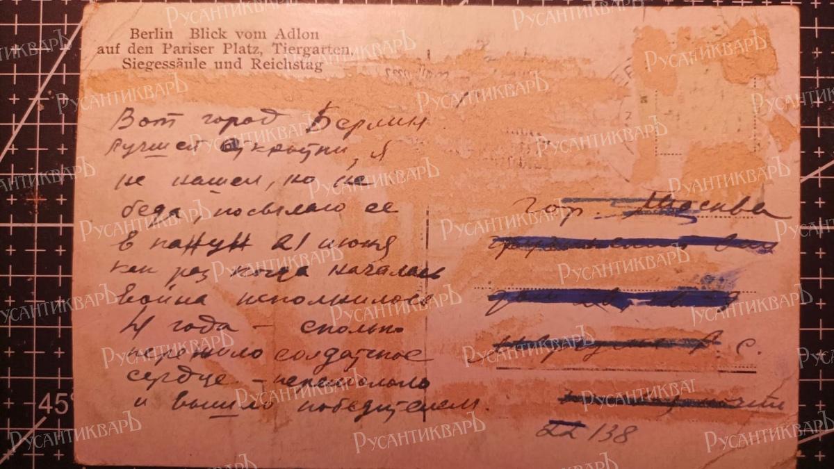 "Вот город Берлин! Лучшей открытки я не нашел, но не беда, посылаю её в канун 21 июня как раз когда началась война исполнилось 4 года - сколько перенесло солдатское сердце - перемололо и вышло победителем."(Орфография и пунктуация сохранены).