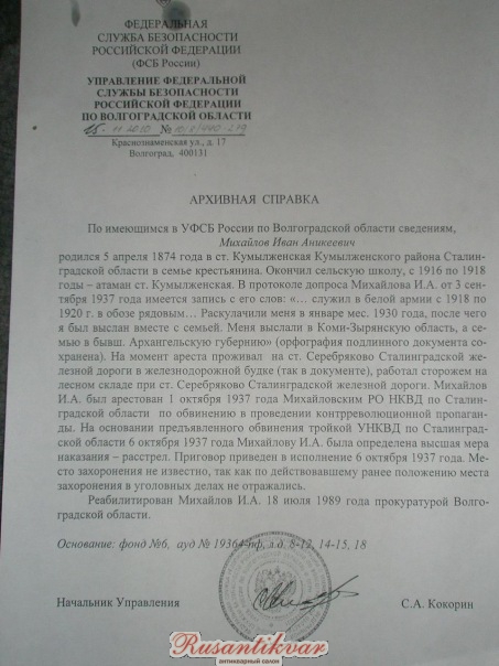 Мой прапрадед по линии отец-отец отца (дед) - отец деда (прадед) - отец прадеда Иван Аникеевич Михайлов. Последний атаман станицы Кумылженской (в разные времена она входила в состав Хоперского и Усть-Медведицкого округов) Фото самого Ивана Аникеевича, к сожалению, не сохранились
