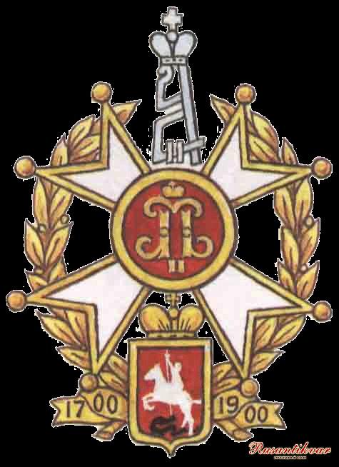 Полковой знак. Утвержден – 11(24).05.1909г. Белый эмалевый крест с золотыми шариками и ободком. В центре его на красном эмалевом кружке золотые соединенные вензеля Императоров Петра I и Николая II. Над крестом серебряный вензель Императора Александра II, бывшего шефа полка. Крест наложен на золотой венок из лавровых ветвей, связанный золотой лентой, на которой надпись: «1700-1900». Под крестом герб Москвы (на красном фоне белый св. Георгий). Щит герба и корона над ним золотые.