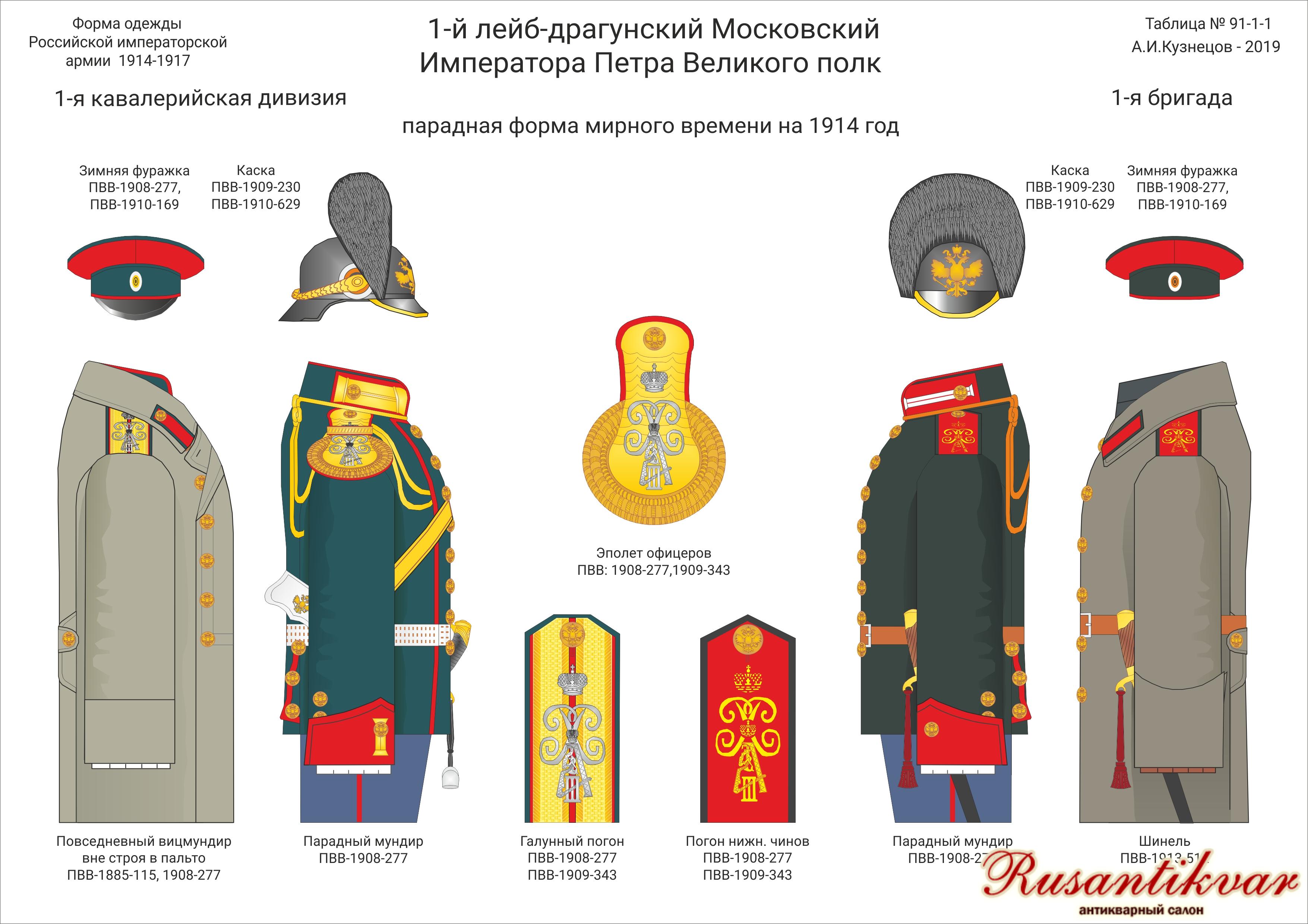 с 27 июня 1909 года — 1-й лейб-драгунский Московский Императора ПЕТРА ВЕЛИКОГО полк.