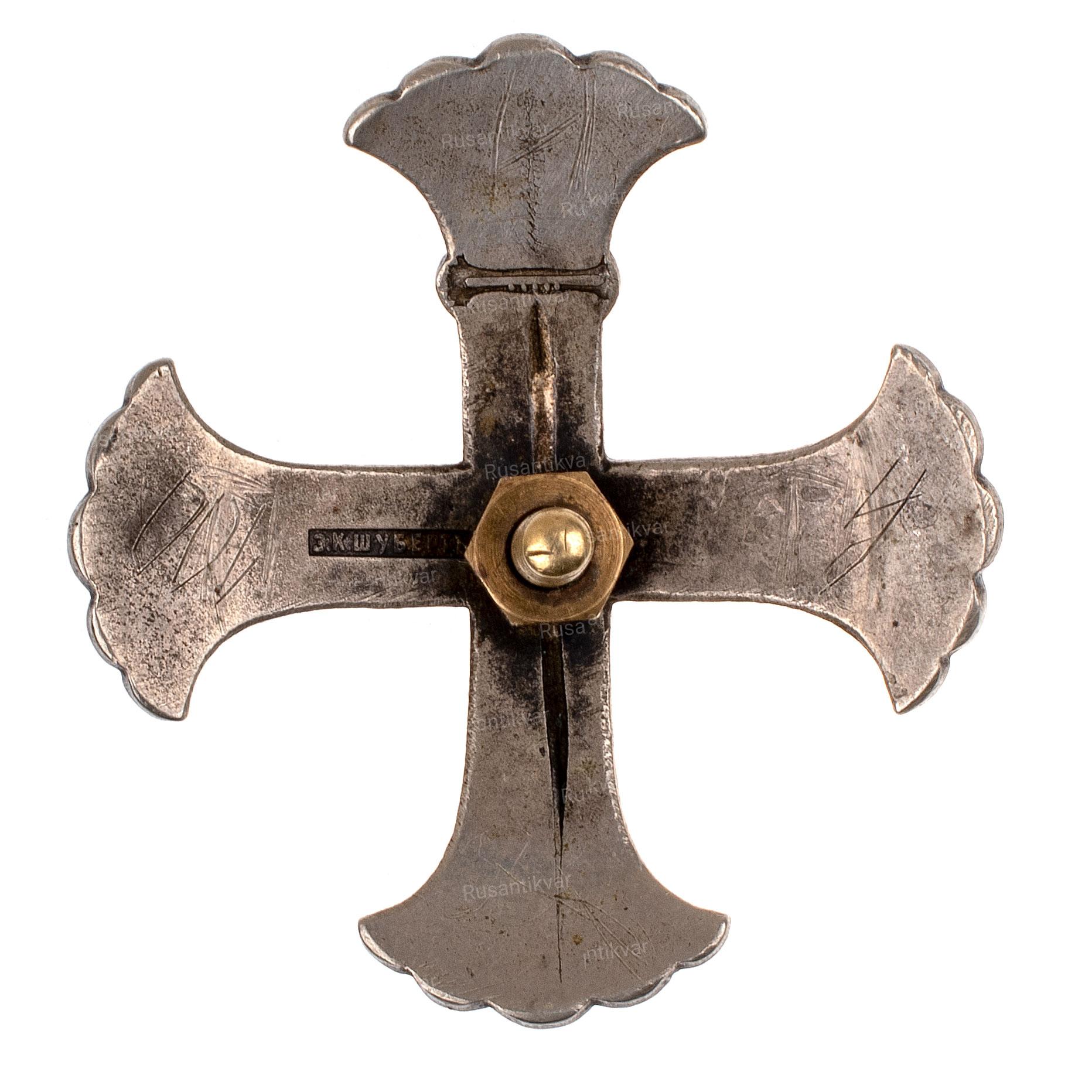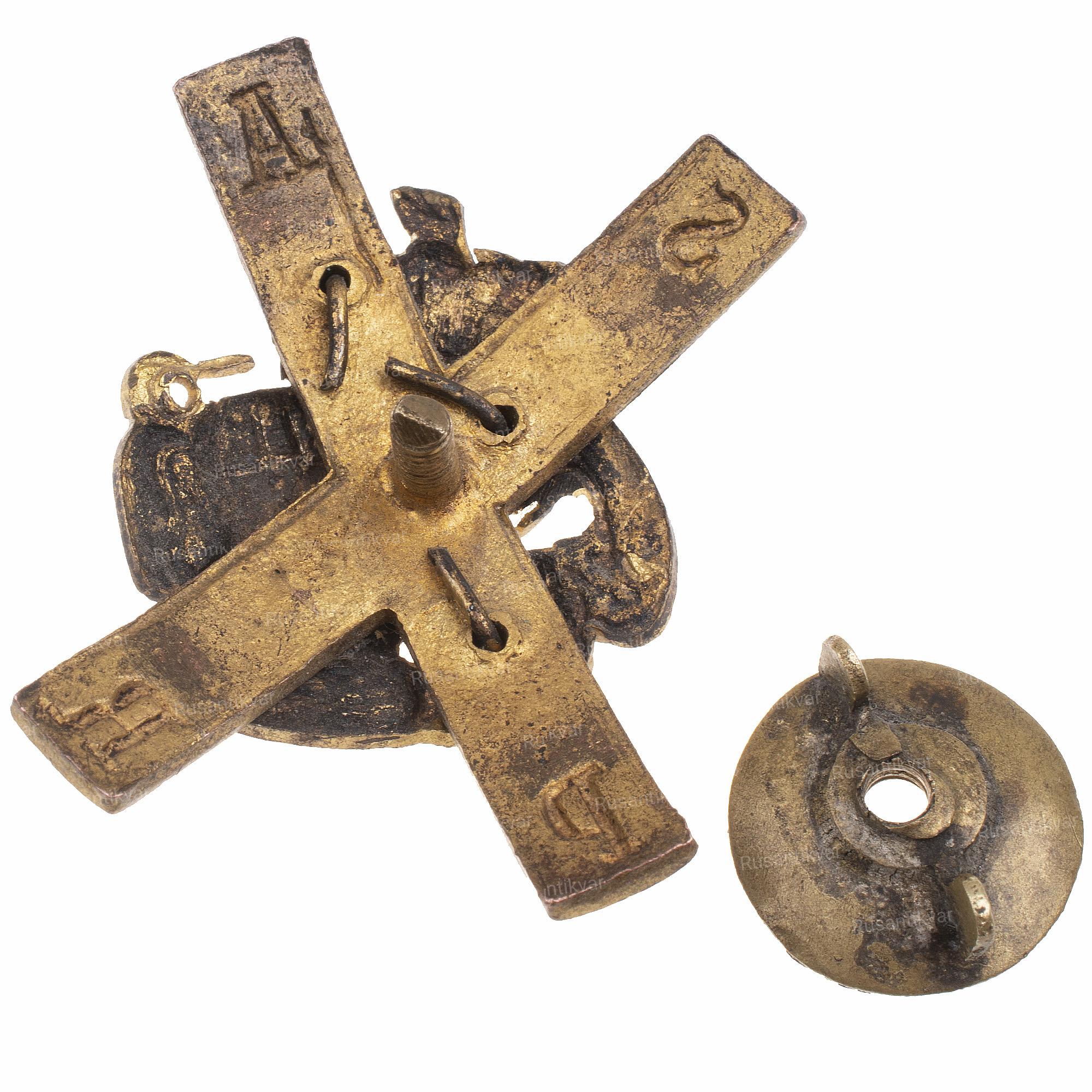 Неизвестная мастерская, Санкт-Петербург, 1911-1917 гг. Бронза, золочение, эмаль. Вес 15,72 гр. Размер 41.55х32.35 мм. Состояние отличное. Утвержден 15 апреля 1911 г. С.В.Патрикеев и А.Д.Бойнович II том №3.1.7. Редкий.