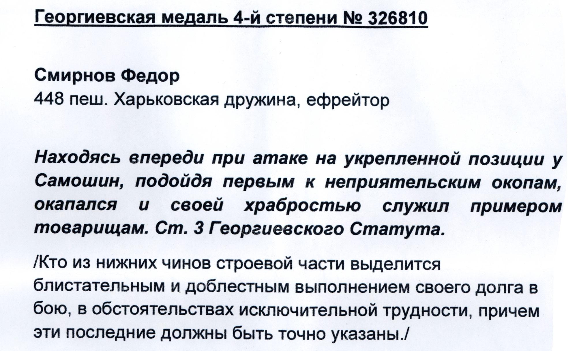 ГМ 4 ст.326810 Смирнов Федор 448 пеш. Харьковская дружина, ефрейтор