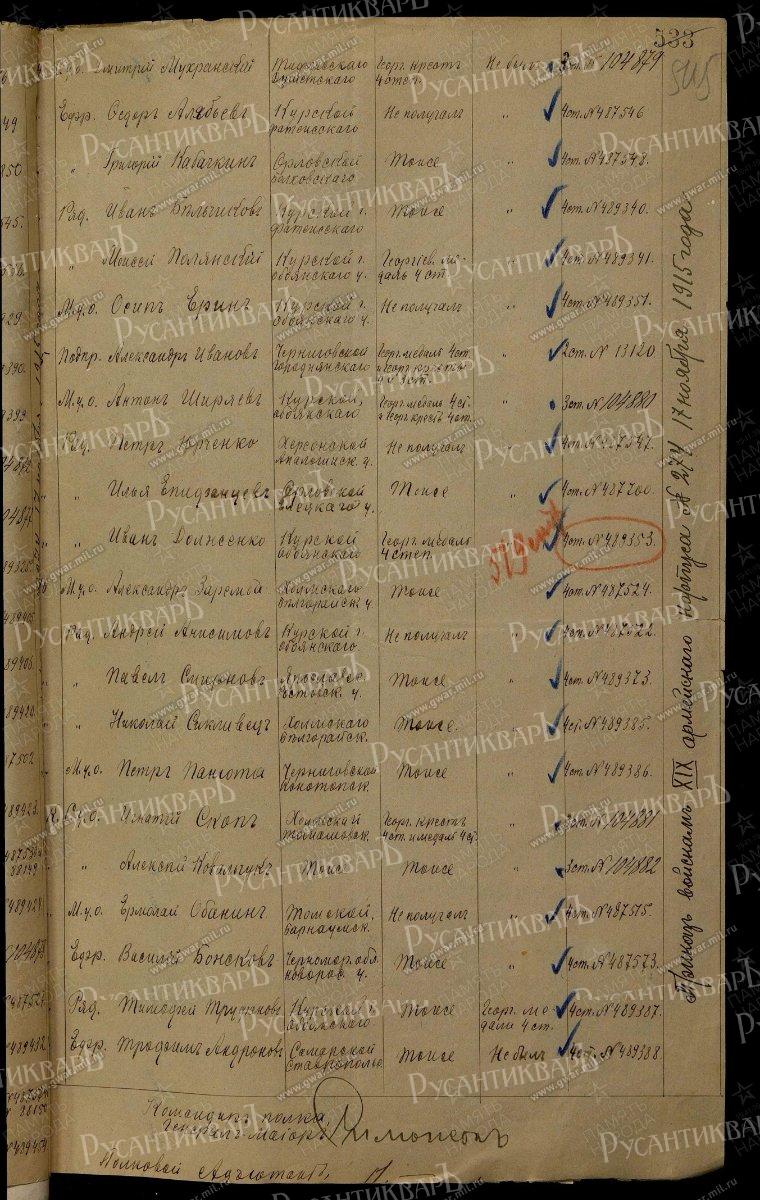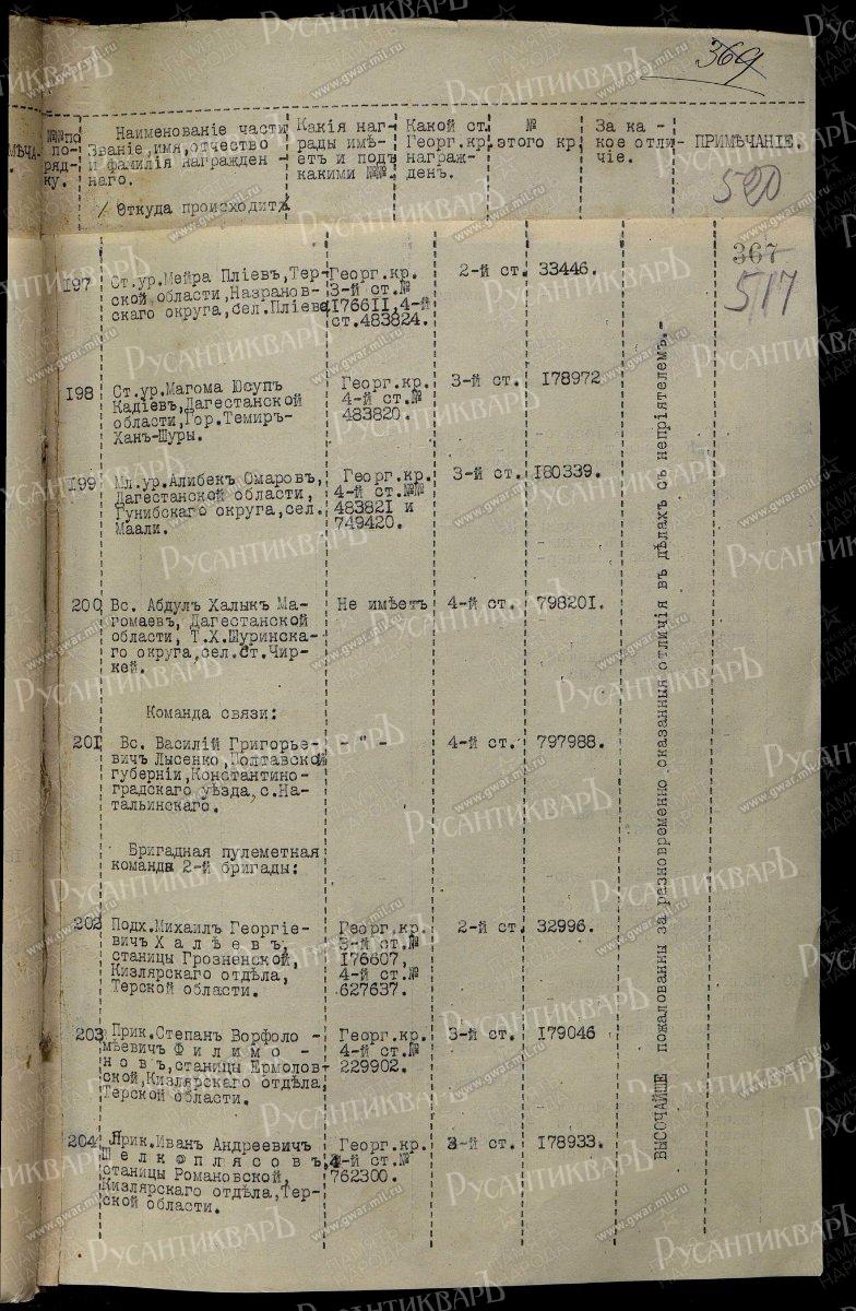 ГК 3 ст. 17161 РЫЖКО Митрофан — 185 пех. Башкадыкларский полк, 15 рота, фельдфебель. За отличия, оказанные в делах против австро-германцев. Награжден на основании п. 5 ст. 67 Георгиевского Статута.