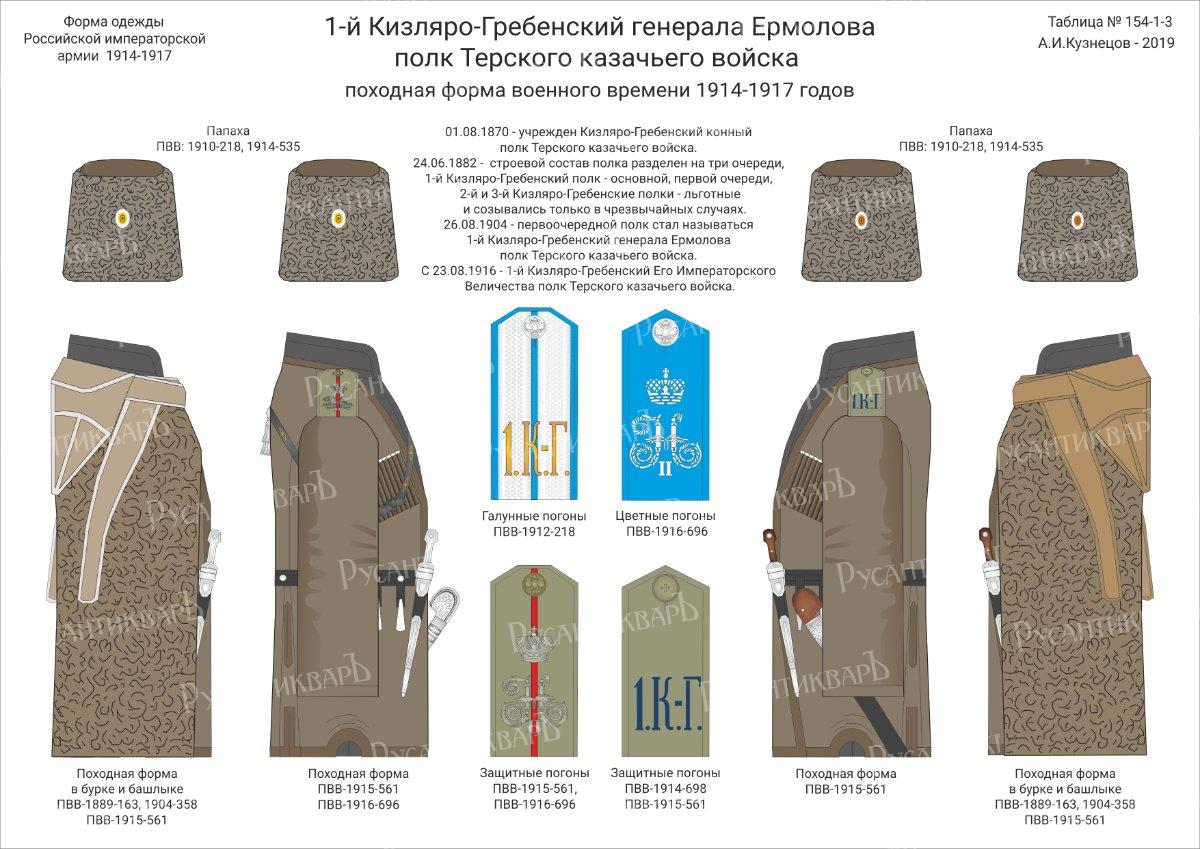 13.08.1870г. - сформирован из Гребенского и Кизлярского казачьих полков. Состоял в составе 3-й Кавказской казачьей дивизии. Квартира: Грозный Терской области (07.1914г.). 8.03.1881г.. 6.12.1908г. 13.08.1870г. - сформирован из Гребенского и Кизлярского казачьих полков. 1.07.1914 – в составе полка 26 офицеров, 845 казаков (в том числе 6 вахмистров, 14 старших урядников, 25 младших урядников, 50 приказных и 668 строевых казаков). 1.12.1914 - в полку состояло: 15 офицеров, 3 врача, 1 военный чиновник, 663 строевых и 70 нестроевых казака. 08.1917 - полк отправлен в район Одессы. 12.1917 - вернулся в Терскую область. 06.1918 – возрожден в Добровольческой армии.