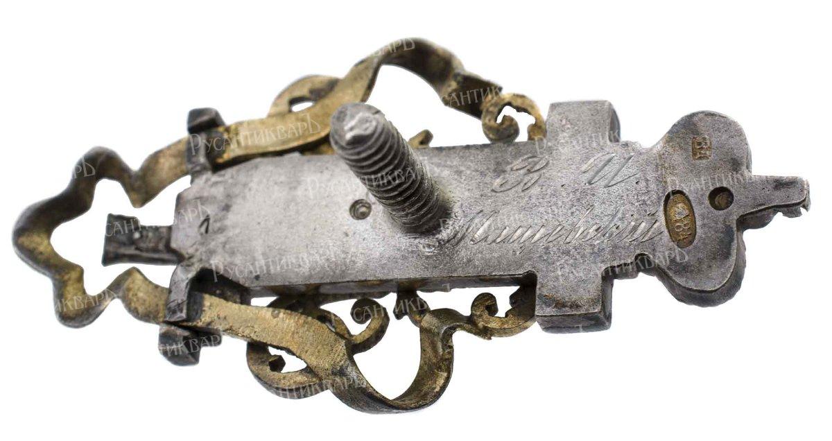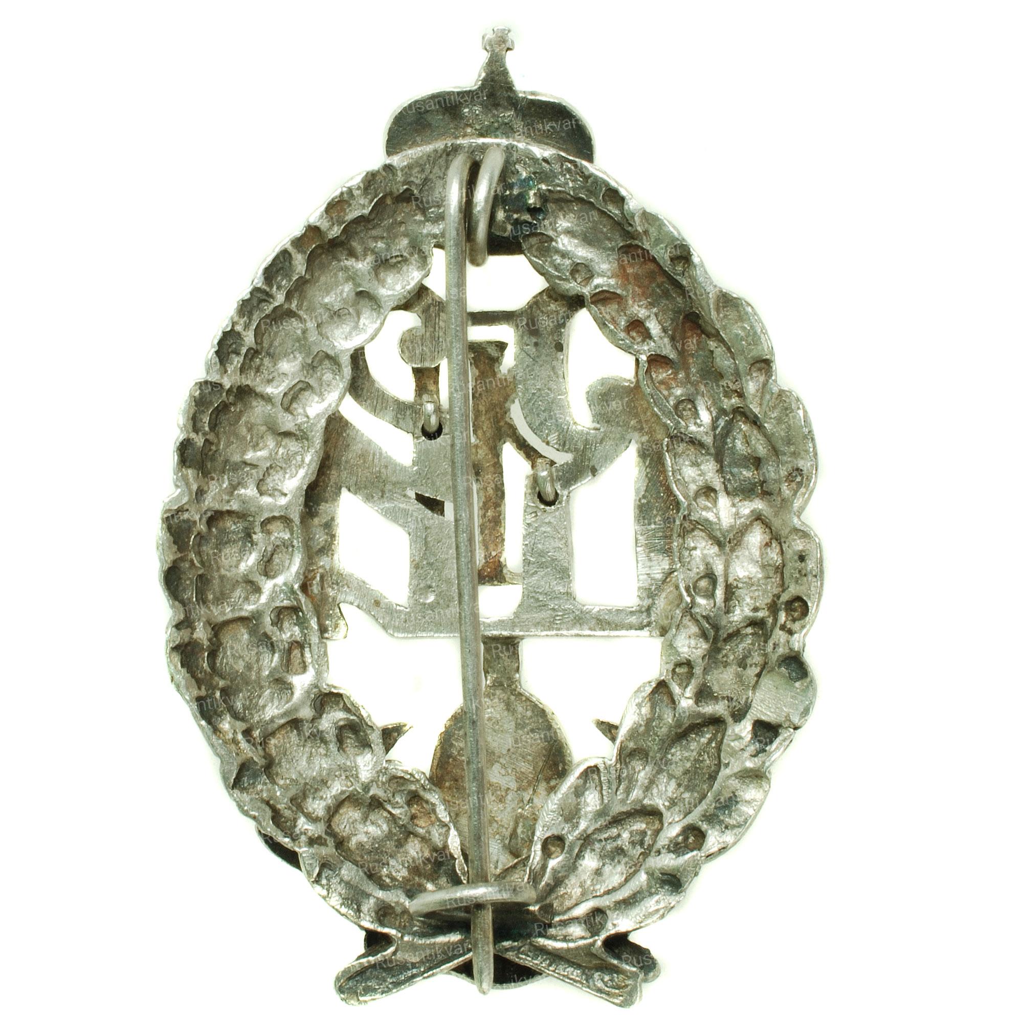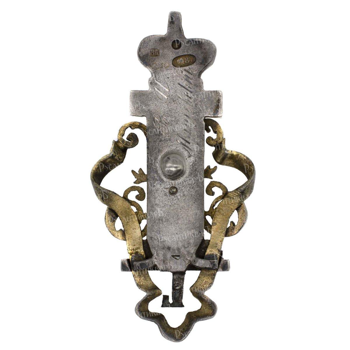 Российская Империя. Фирма «Эдуард». Клейма на оборотной стороне знака вверху: Петроградского окружного пробирного управления с пробой металла [альфа, женская головка в кокошнике, вправо, 84] в овальном щитке; знак удостоверения [женская головка в кокошнике, вправо, в круглом щитке] и именное клеймо «ВД» в прямоугольном щитке; на закрутке клеймо Петроградского окружного пробирного управления в круглом щитке [женская головка в кокошнике, вправо, точка под подбородком]. Серебро, позолота, эмаль