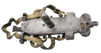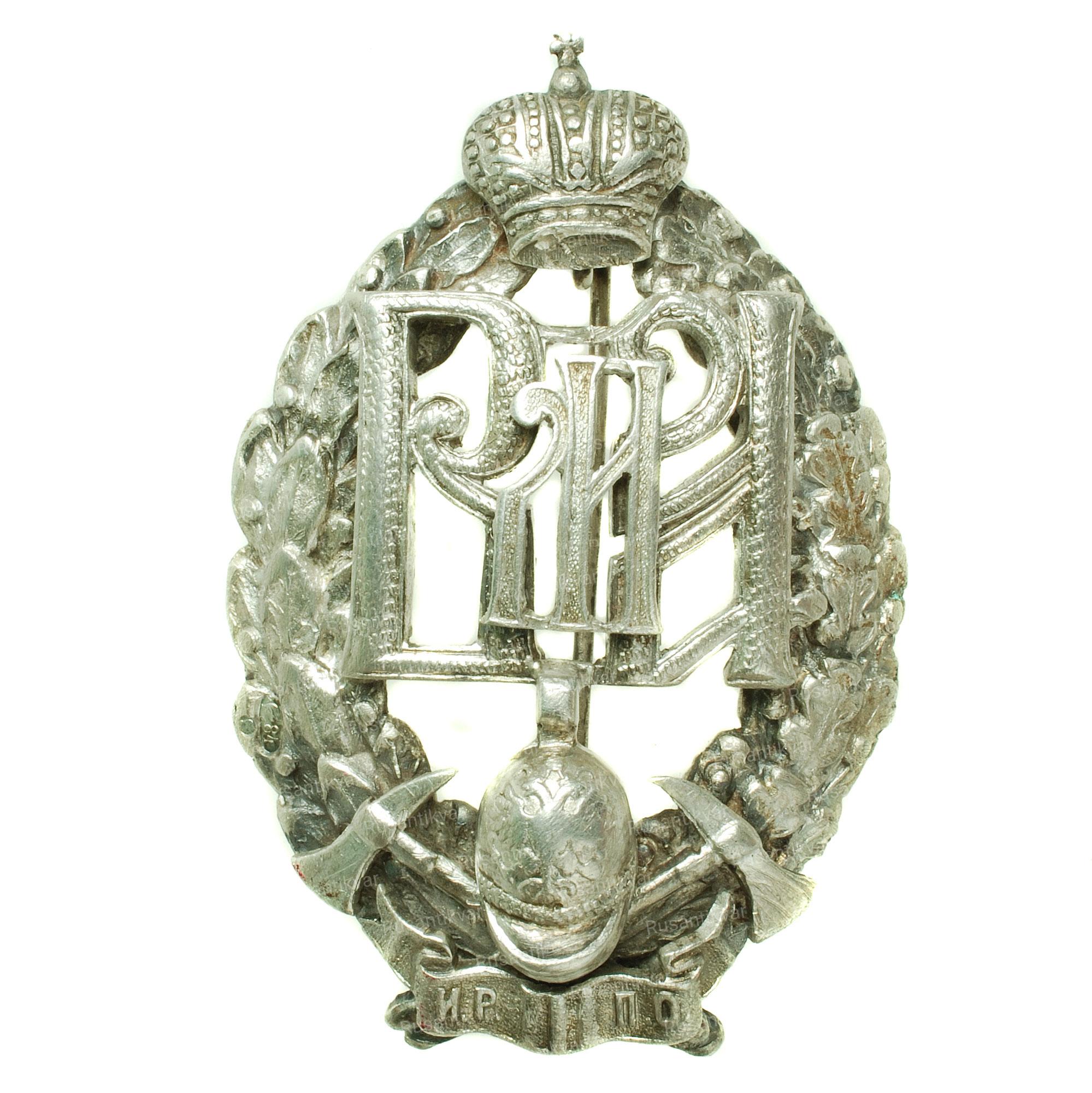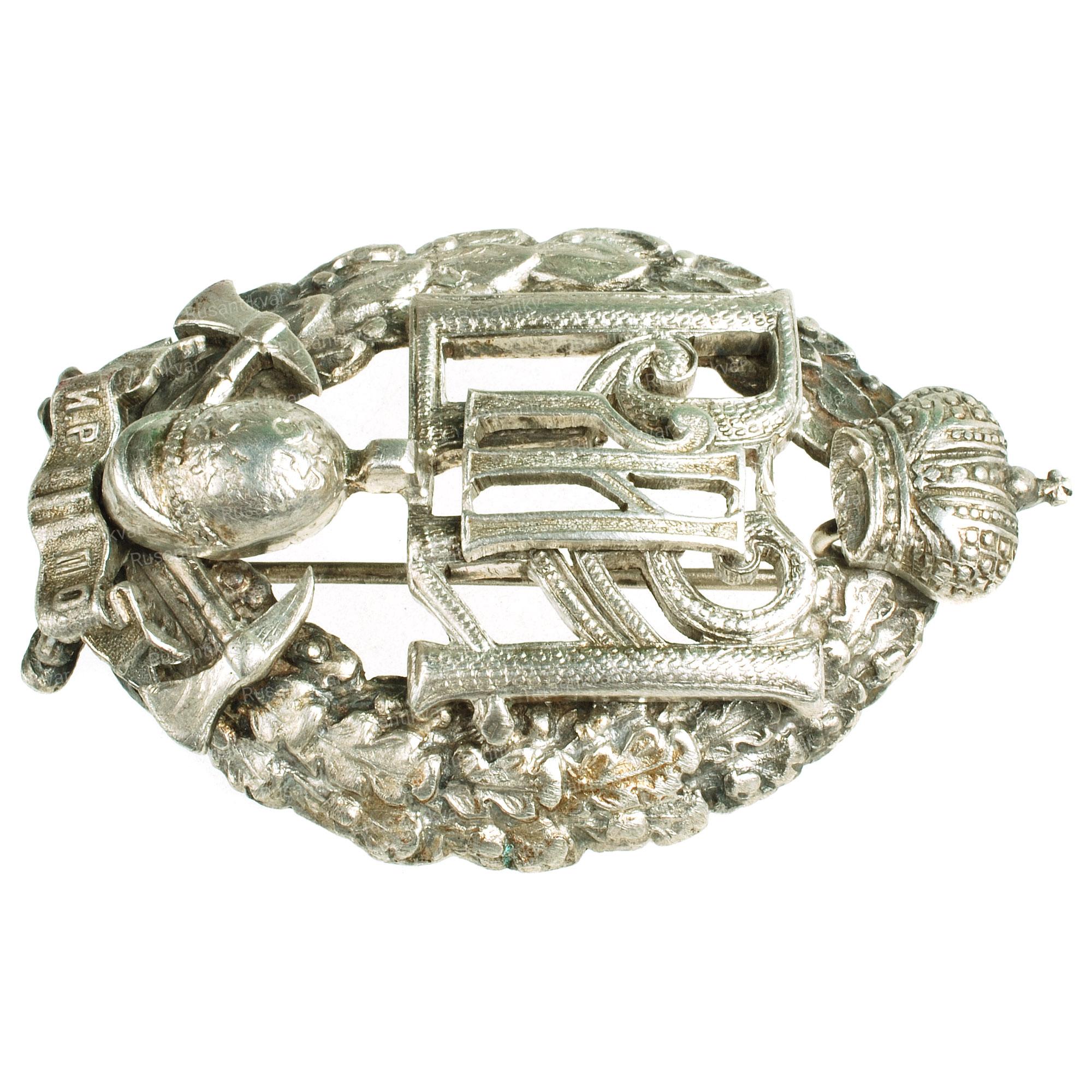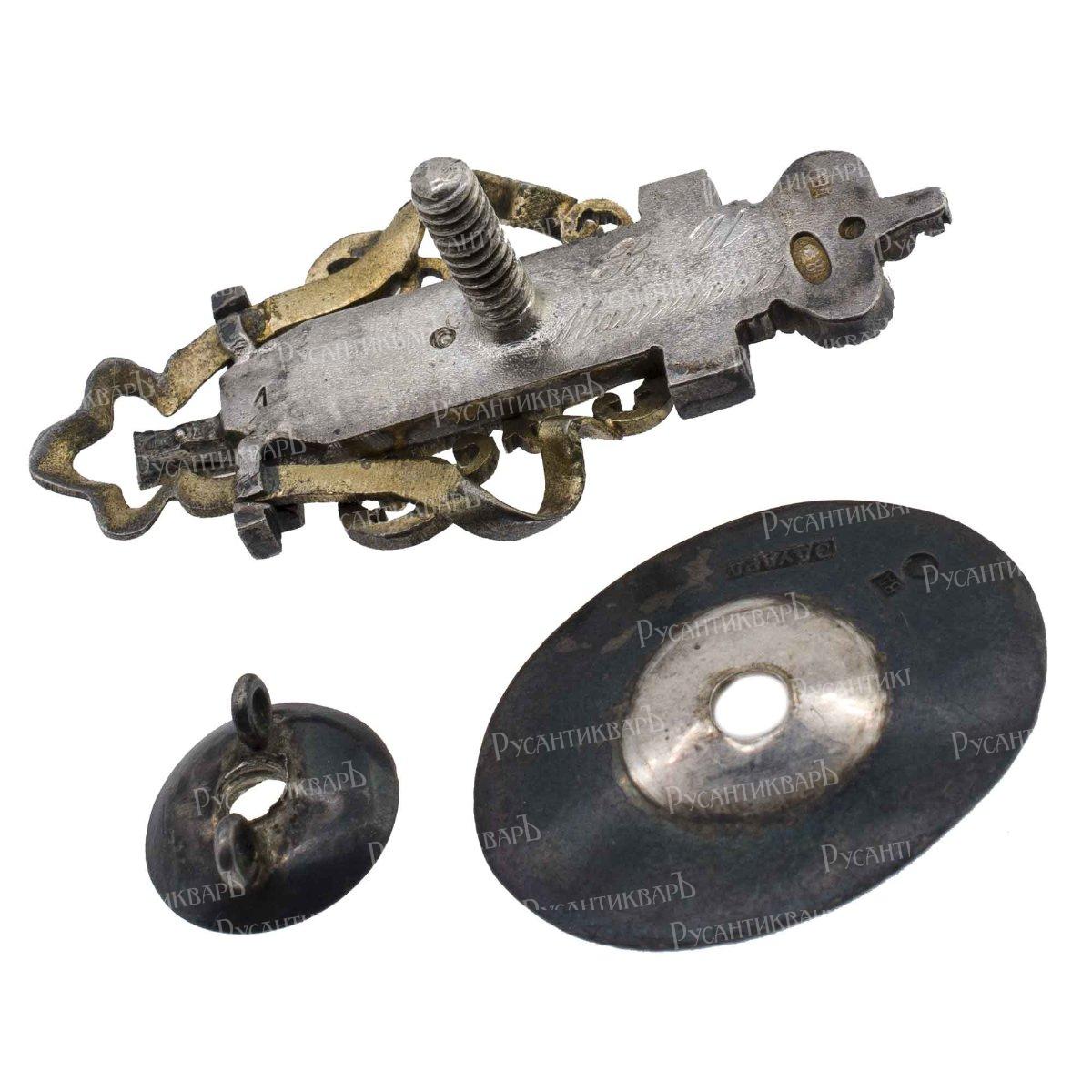 Российская Империя. Фирма «Эдуард». Клейма на оборотной стороне знака вверху: Петроградского окружного пробирного управления с пробой металла [альфа, женская головка в кокошнике, вправо, 84] в овальном щитке; знак удостоверения [женская головка в кокошнике, вправо, в круглом щитке] и именное клеймо «ВД» в прямоугольном щитке; на закрутке клеймо Петроградского окружного пробирного управления в круглом щитке [женская головка в кокошнике, вправо, точка под подбородком]. Серебро, позолота, эмаль
