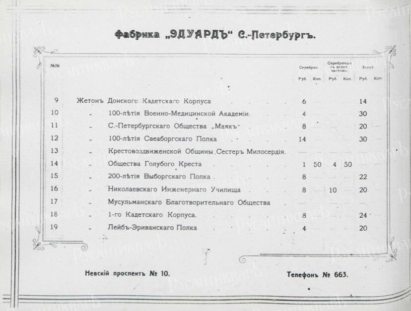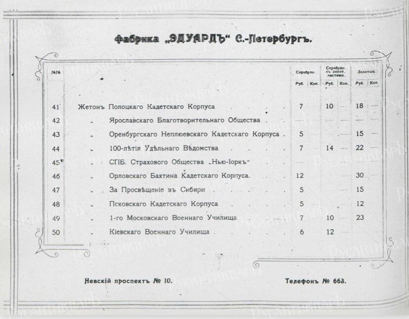 Прейскурант цен на ордена Российской Империи фирмы "Эдуард".
