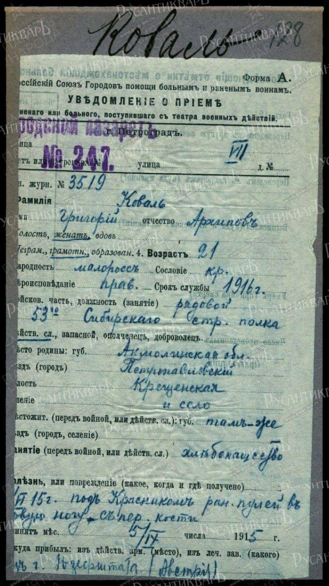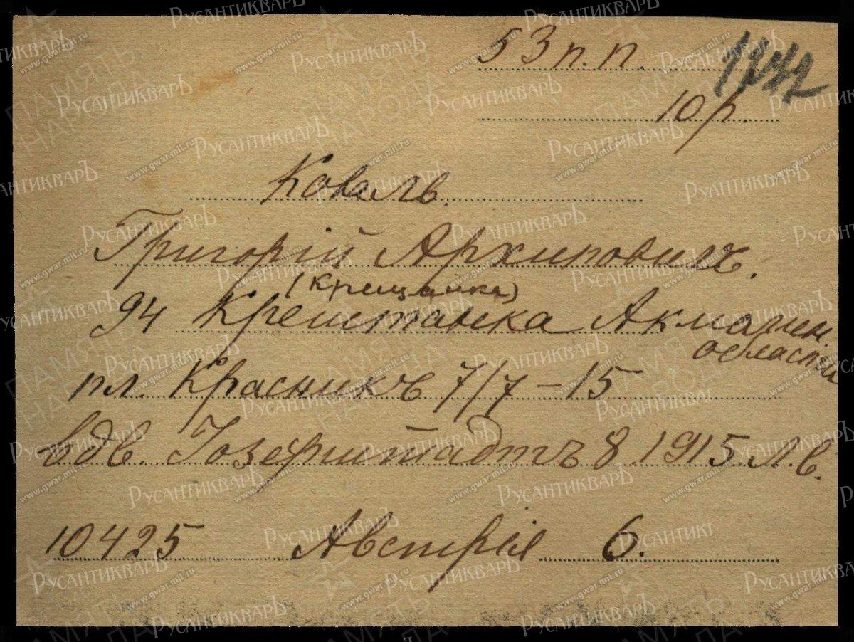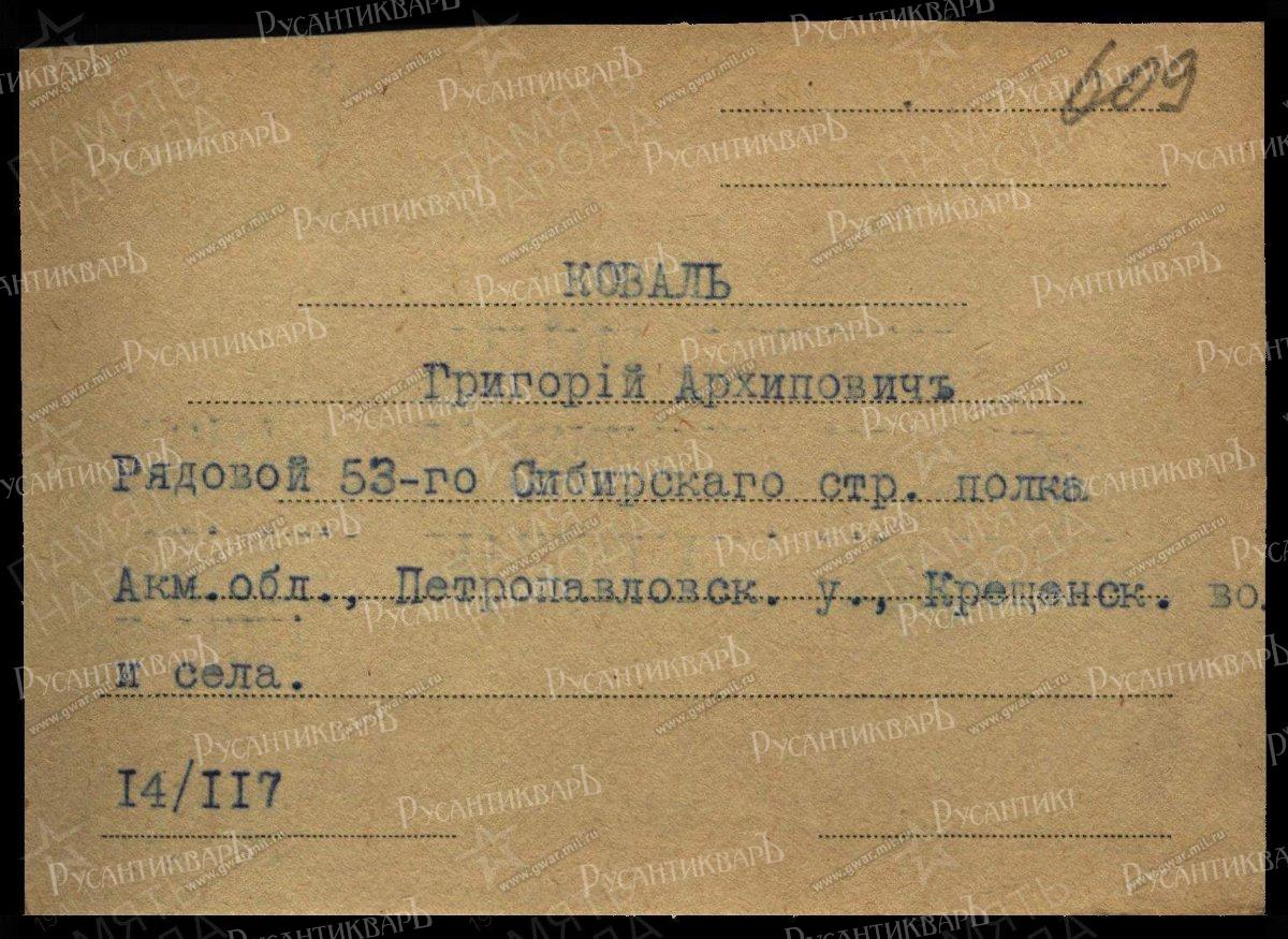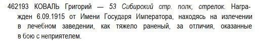 Георгиевским Крестом 4 ст с номером 462.193 награждён КОВАЛЬ Григорий — 53 Сибирский стр. полк, стрелок. Награжден 6.09.1915 от Имени Государя Императора, находясь на излечении в лечебном заведении, как тяжело раненый, за отличия, оказанные в бою с неприятелем.