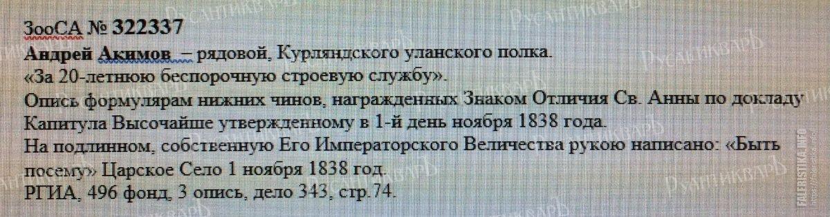 Знаком отличия ордена Св. Анны (Анненская медаль) - 322.337 награжден Андрей Акимов рядовой, Курляндского уланского полка, "За 20-летнюю беспорочную строевую службу". Опись формулярам нижних чинов, награжденных Знаком Отличия Св. Анны по докладу Капитула Высочайше утвержденному в 1-й день ноября 1838 года. На подлинном, собственную Его Императорского Величества рукою написано: "Быть посему" Царское Село 1 ноября 1838 год.