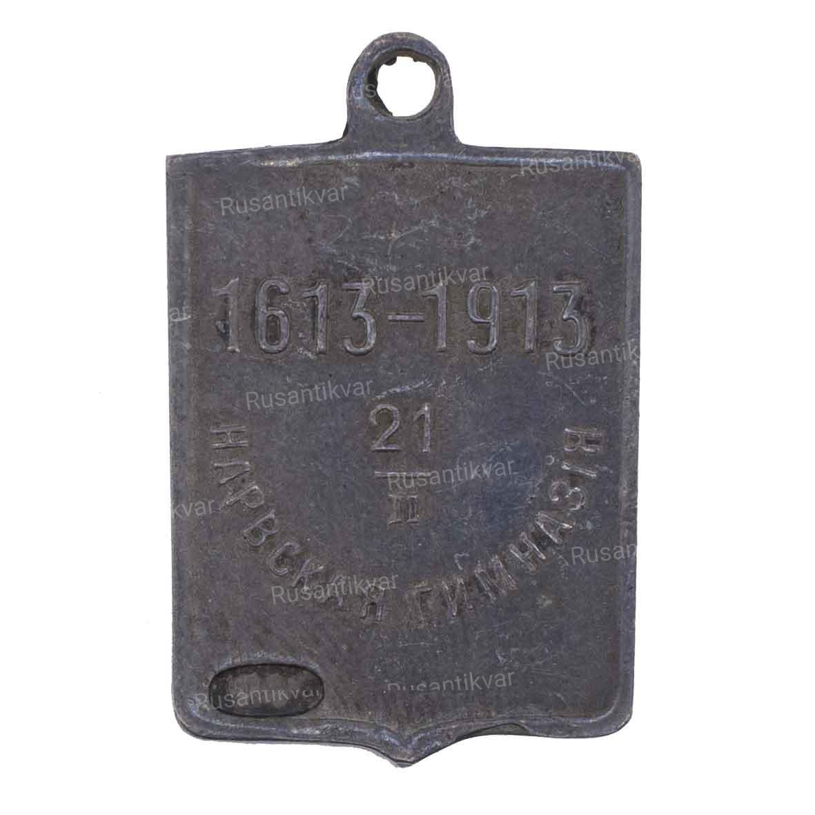 "Жетон об окончании Нарвской гимназии «В память 300-летия Дома Романовых. 21/II». Неизвестная мастерская. Россия, 1913 г. Серебро, 5,50 гр. Размер 26х16.6 мм. Клеймо на оборотной стороне: пробирное « 84» с женской головкой вправо. Состояние XF(красивая патина). Руденко «Корпус...»№2103,76(R1)."