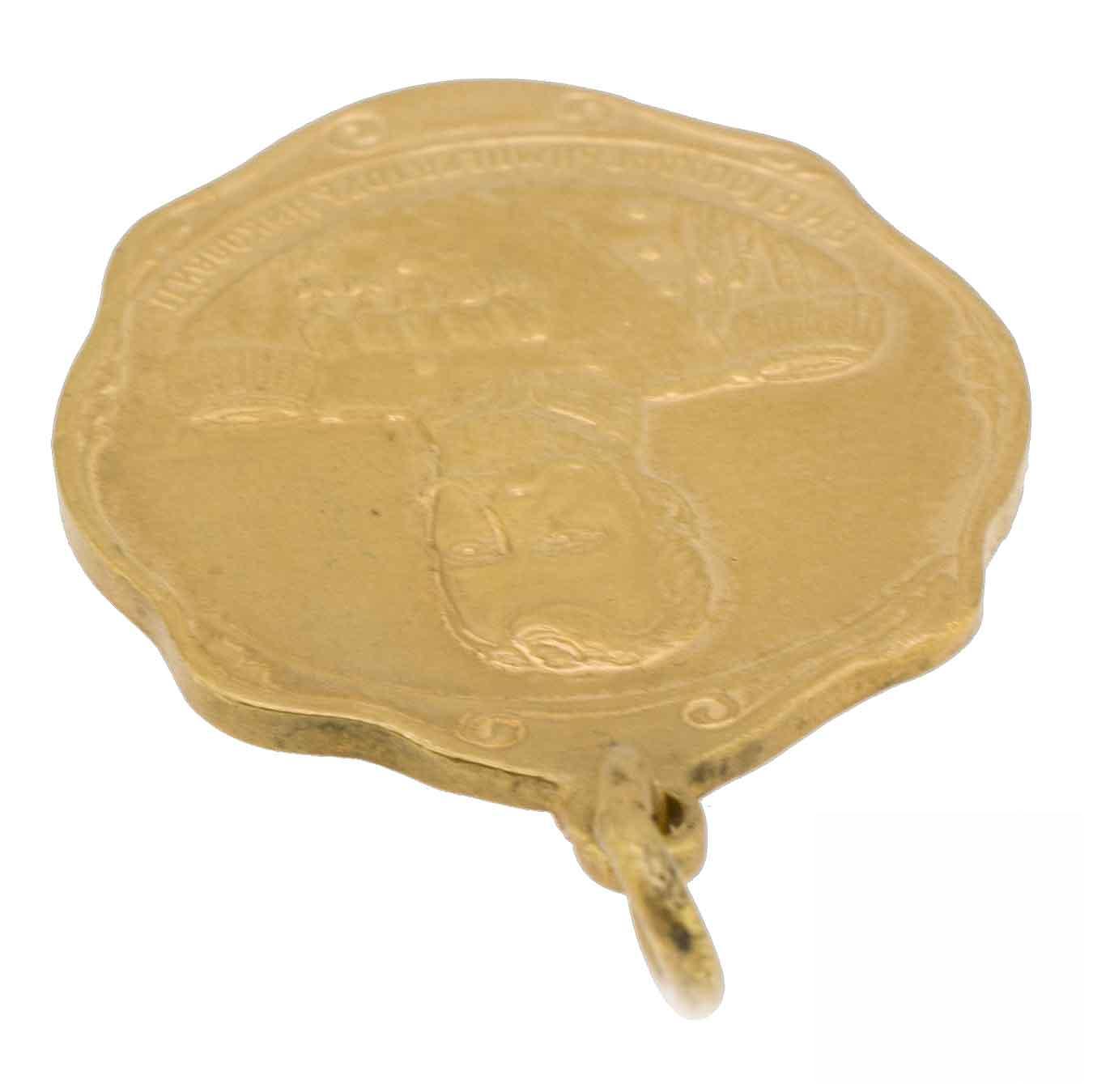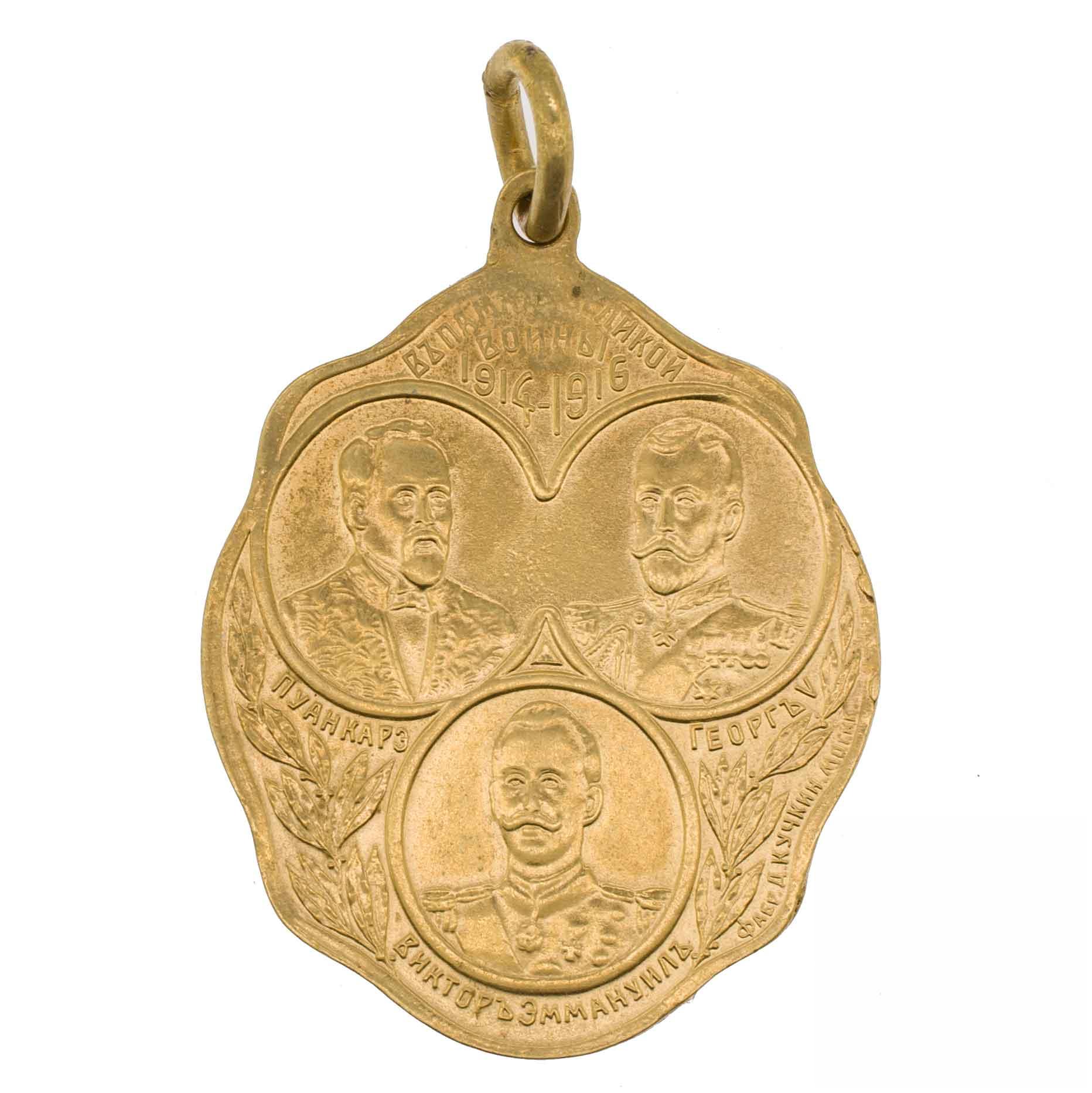 Жетон «В память Великой войны. 1914- 1915 гг.» Мастерская Д. Кучкина, Москва, 1916 г. Медь, золочение. Вес 7,41 гр. Размер 35.9х27.1 мм. Подпись мастерской на оборотной стороне справа: «Фабр.Д.Кучкин. Москв.»