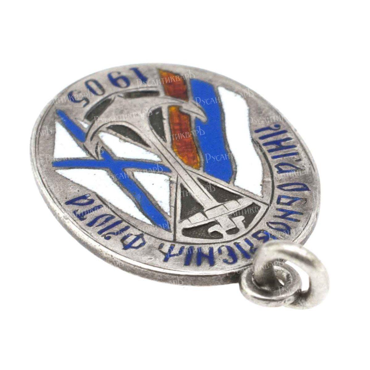 Жетон Лиги обновления флота. С.-Петербург, 1905–1908 гг. Фирма «Д.Осипов». Клейма на оборотной стороне жетона внизу: проба металла с инициалами управляющего СПб пробирным округом А.В.Романова «84 АР» и именное клеймо «ДО». Серебро, эмаль, 4.24 г. Размеры 26.9 × 17.5 мм. Сохранность отличная, красивая патина. Доценко# 144. Аналоги с булавкой на об. ст. см. Бойнович, Доценко# 177. Бойнович, Сибирцев# 1.161.