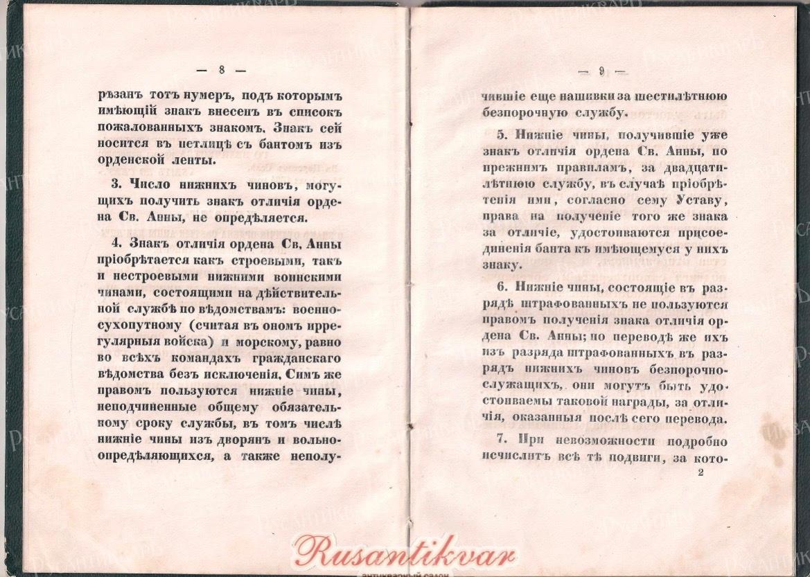 9.Особые подвиги и заслуги нижних чинов должны быть немедленно объявляемы приказами по полкам и другим отдельным частям или управлениям, по принадлежности, и эти приказы должны служить основанием для представления отличившихся к награде знаком отличия ордена Св. Анны.