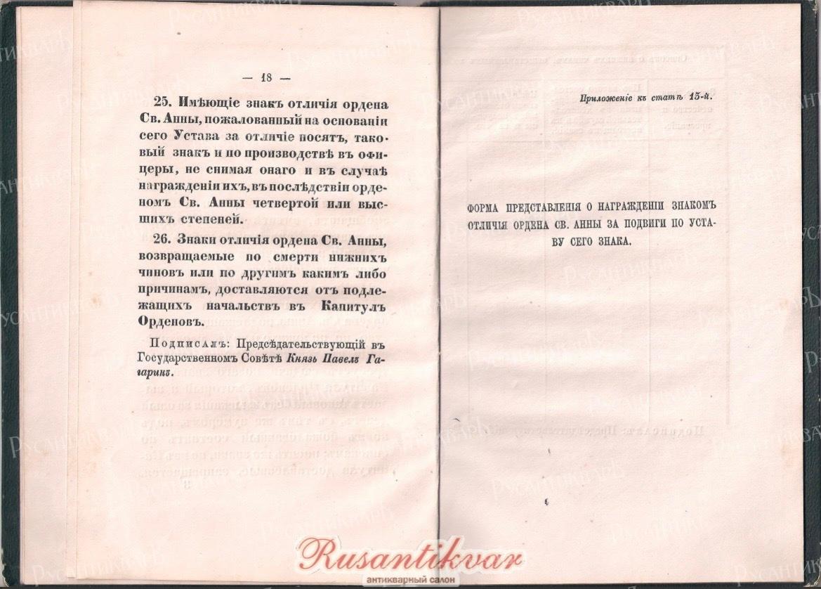 Высочайше утверждённый Устав о знаке отличия ордена Св. Анны для нижних воинских чинов.