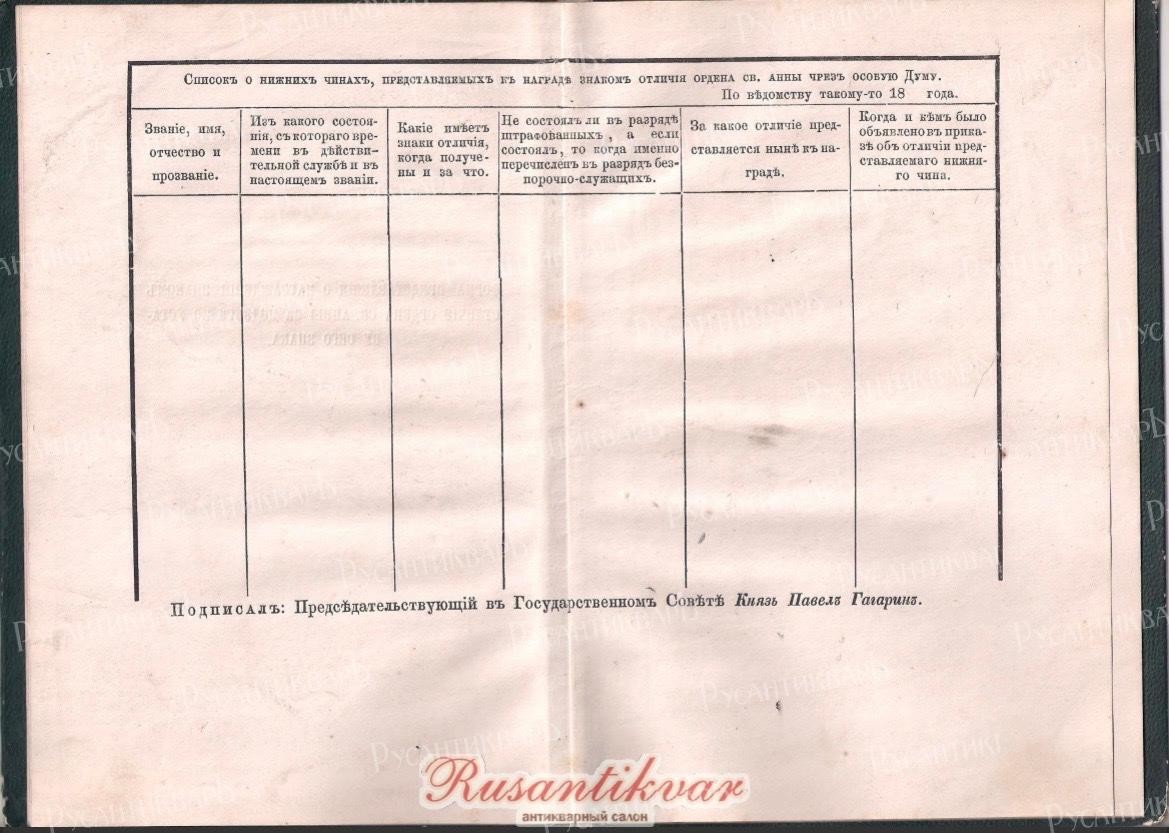 18.Общий список, удостаиваемых Думою к награде знаком отличия ордена Св. Анны нижних чинов, за оказанные ими особенные подвиги и заслуги, с означением против каждого предполагаемой ему единовременной денежной выдачи, препровождается Председателем Думы к Канцлеру Орденов, а им подносится Его Императорскому Величеству на утверждение.
