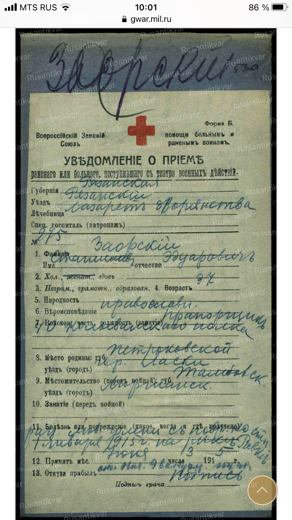 Был ранен 1.01.1915 г.