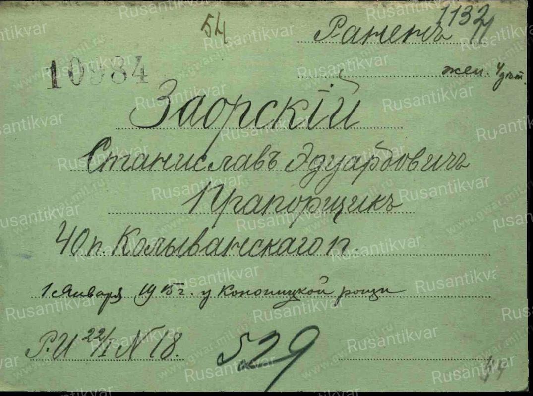Заорский Станислав Эдуардович-40 пехотный Колыванский полк,прапорщик,пулемётная команда.За отличие в бою 18.11.1914 у д.Недвзяды.
