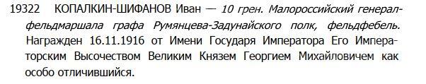 Георгиевский крест 2 степени №19322 КОПАЛКИН-ШИФАНОВ Иван — 10 грен. Малороссийский генерал- фельдмаршала графа Румянцева-Задунайского полк, фельдфебель.