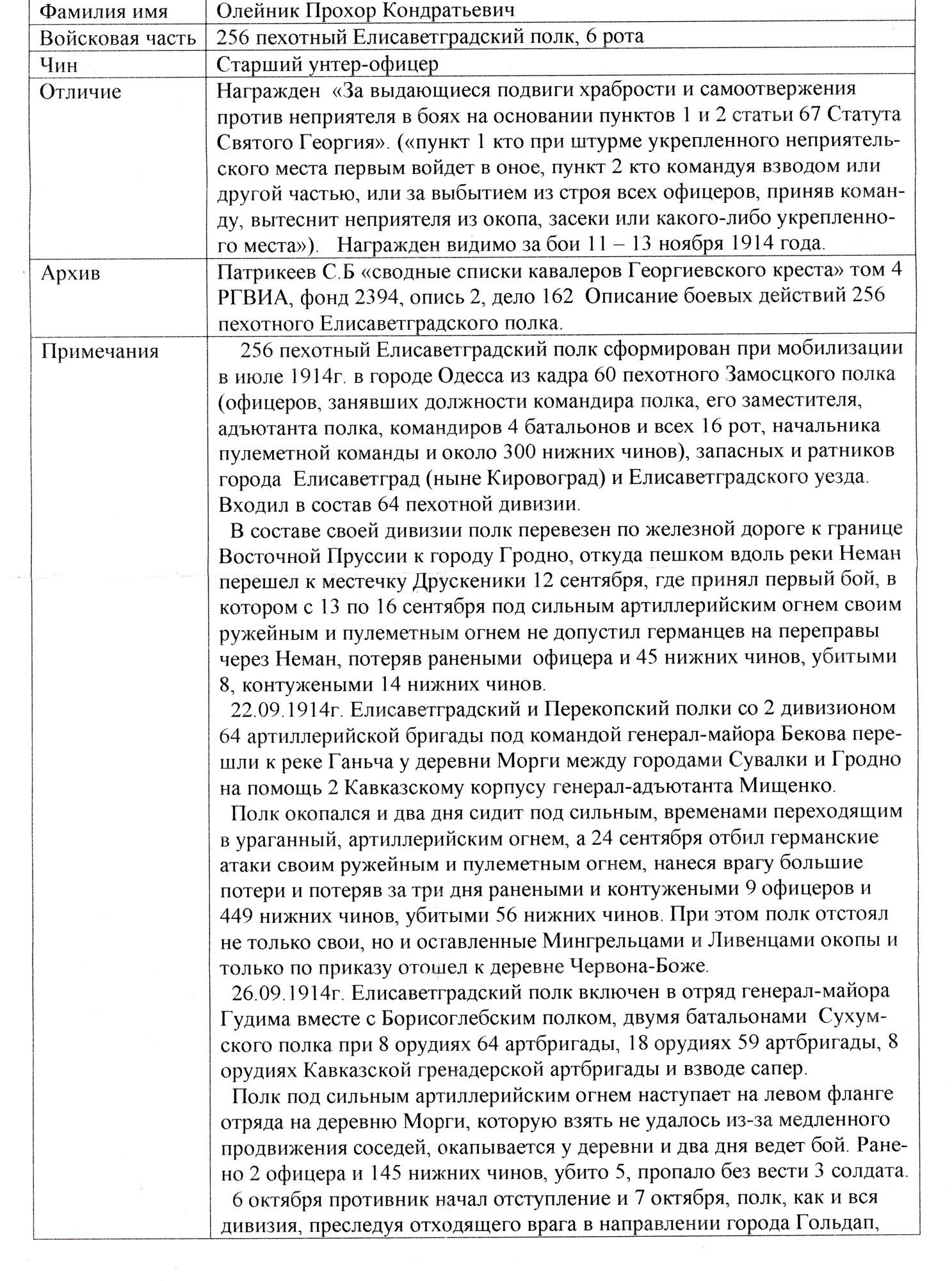 Георгиевский крест 4 степени №38.491 ОЛЕЙНИК Прохор Кондратьевич-256 пех.Елисаветградский полк, 6 рота, ст.унтер-офицер. За выдающиеся подвиги храбрости и самоотвержения протв неприятеля в боях. Награжден на основании п.п. 1 и 2 ст.67 Георгиевского Статута.