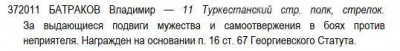 ГК 4 степени №372011 БАТРАКОВ Владимир — 11 Туркестанский стр. полк, стрелок. За выдающиеся подвиги мужества и самоотвержения в боях против неприятеля. Награжден на основании п. 16 ст. 67 Георгиевского Статута.