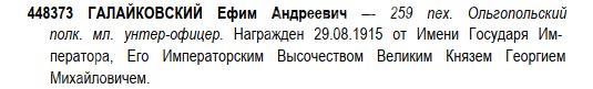 ГК 4 ст. 448373 ГАЛАЙКОВСКИЙ Ефим Андреевич — 259 пех. Ольгопольский полк. мл. унтер-офицер. Награжден 29.08.1915 от Имени Государя Императора, Его Императорским Высочеством Великим Князем Георгием Михайловичем.
