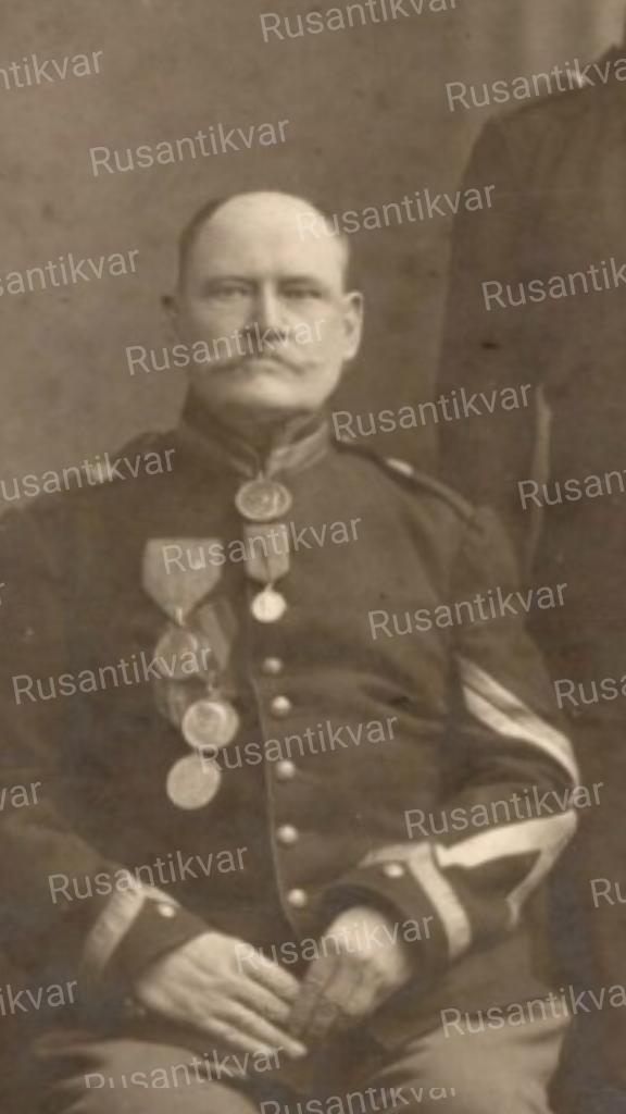 На фото фельдфебель кавалерии,кандидат на классную должность.Судя по выслужным шевронам и четырем шейным медалям "За усердие" с выслугой в армии более 20-ти лет.Фото до 1909 года. Интересен способ ношения шейных медалей на колодках.