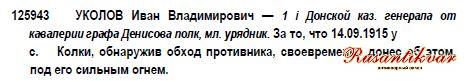 ГК 3 степ.№125.943 Уколов Иван Владимирович- 1 Донской каз.генерала от кавалерии графа Денисова полк,мл.урядник.За то, что 14.09.1915 у с.Колки, обнаружив обход противника, своевременно донес об этом, под его сплошным огнем.