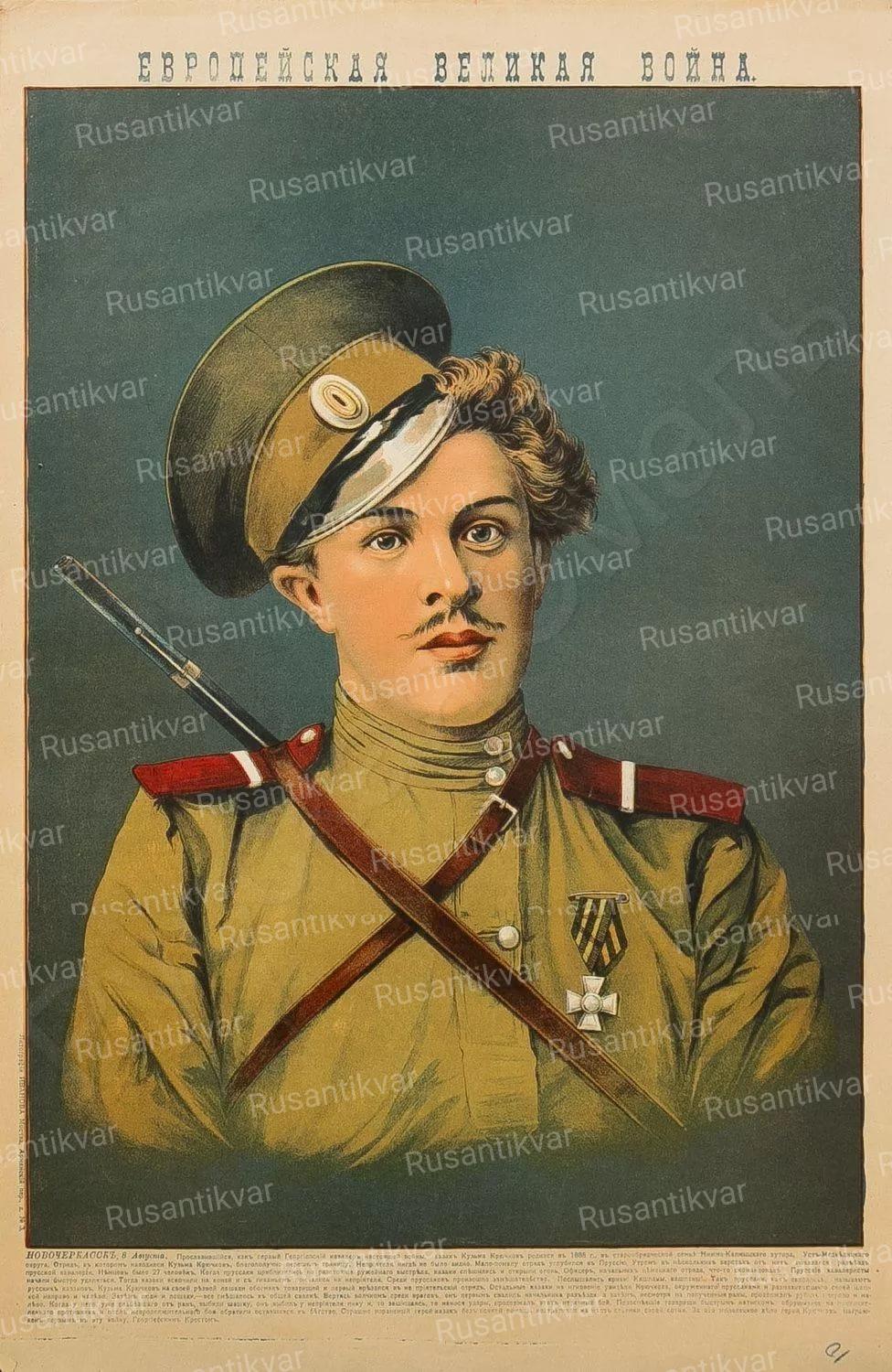 «За то,что встретив с 4-мя казаками вражеский разъезд из 22 немецких кавалеристов,лично убил офицера и нескольких всадников,всего 11 человек,получив при этом 16 ран».