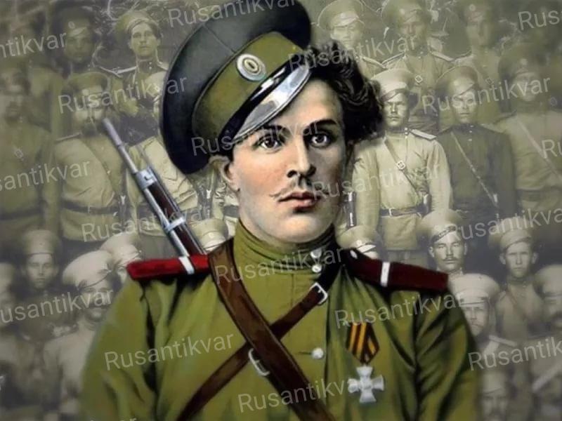 «Начальствуя разъездом из четырех орлов-донцов,атаковал и опрокинул немецкий разъезд из 22 всадников,получив при этом 16 ран пикой».