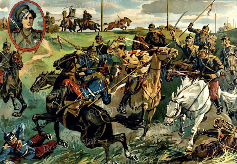 Разведочный отряд из четырех казаков, в котором находился Кузьма Крючков, благополучно перешел границу. Неприятеля нигде не было видно. Мало-помалу отряд углубился в Пруссию. В небольшой роще казаки заночевали. Утром в нескольких верстах от них показался разъезд прусской кавалерии в 27 человек. Когда пруссаки приблизились на расстояние ружейного выстрела, казаки спешились и открыли огонь. Офицер, начальник немецкого отряда, что-то скомандовал. Прусские кавалеристы стали быстро удаляться. Казаки вскочили на коней и с гиканьем помчались на неприятеля. Кузьма Крючков на своей резвой лошади обогнал товарищей и первый врезался в неприятельский отряд. Подоспевшие остальные казаки на мгновение увидели Крючкова, окруженного пруссаками и размахивающего своей шашкой направо и налево. Затем люди и лошади, — всё смешалось в общей свалке. Один из казаков увидел, как в этой свалке к Крючкову протискивается прусский офицер с обнаженной шашкой. Казак выстрелил. Прусский офицер упал. Крючков тем временем тоже выхватил винтовку и хотел выстрелить в прусского унтер-офицера, но тот ударил Крючкова саблей по руке, рассек ему пальцы, и казак выронил винтовку. В следующий момент, несмотря на полученную рану, Крючков рассек унтер-офицеру шею. Два пруссака с пиками набросились на Крючкова, пытаясь выбить его из седла, но Крючков ухватился руками за неприятельские пики, рванул их к себе и сбросил обоих немцев с коней. Затем, вооружившись прусской пикой, Крючков опять бросился в бой. Прошло несколько минут — и из 27-ми пруссаков, сражавшихся с 4-мя донскими казаками, остались на конях только три, которые и обратились в дикое бегство. Остальные были или убиты или ранены. Казаки послали вслед бегущим еще несколько пуль. Кузьма Крючков один свалил 11 немцев и сам получил 16 ран. Ранен пулей. Шашкой разрублена рука. Остальные поранения пиками. Несмотря на все это, Крючков до самого конца боя оставался в строю.