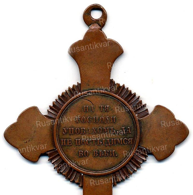 Реверс. В середине креста в сиянии лучей – оборотная сторона медали «В память войны 1853—1856». Надпись: «НА ТЯ ГОСПОДИ УПОВАХОМЪ, ДА НЕ ПОСТЫДИМСЯ ВО ВЕКИ».