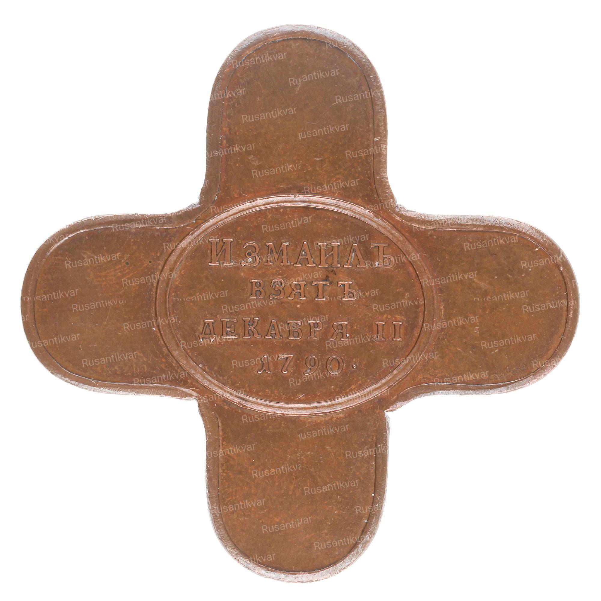 Крест был сделан из золота. Размер креста — 46 × 46 мм. Крест равносторонний четырёхконечный с закруглёнными окончаниями. Центральный медальон выполнен в виде горизонтально ориентированного овала, внутри которого надпись с обеих сторон нанесены надписи. Надпись на лицевой стороне в три строки: «ЗА/ОТМЕННУЮ/ХРАБРОСТЬ». С обратной стороны надпись в четыре строки: «ИЗМАИЛЪ/ВЗЯТЪ/ДЕКАБРЯ 11/1790·».