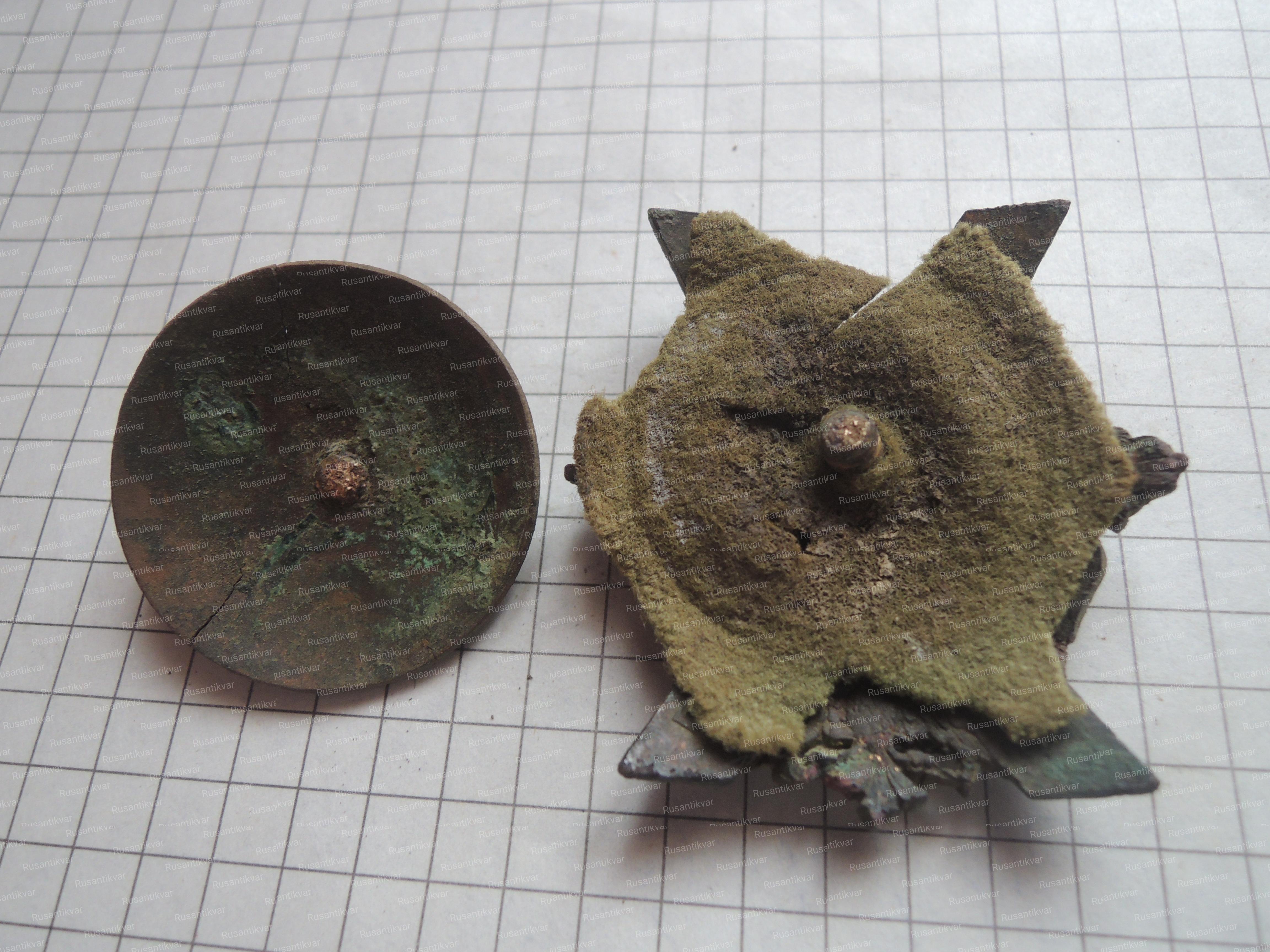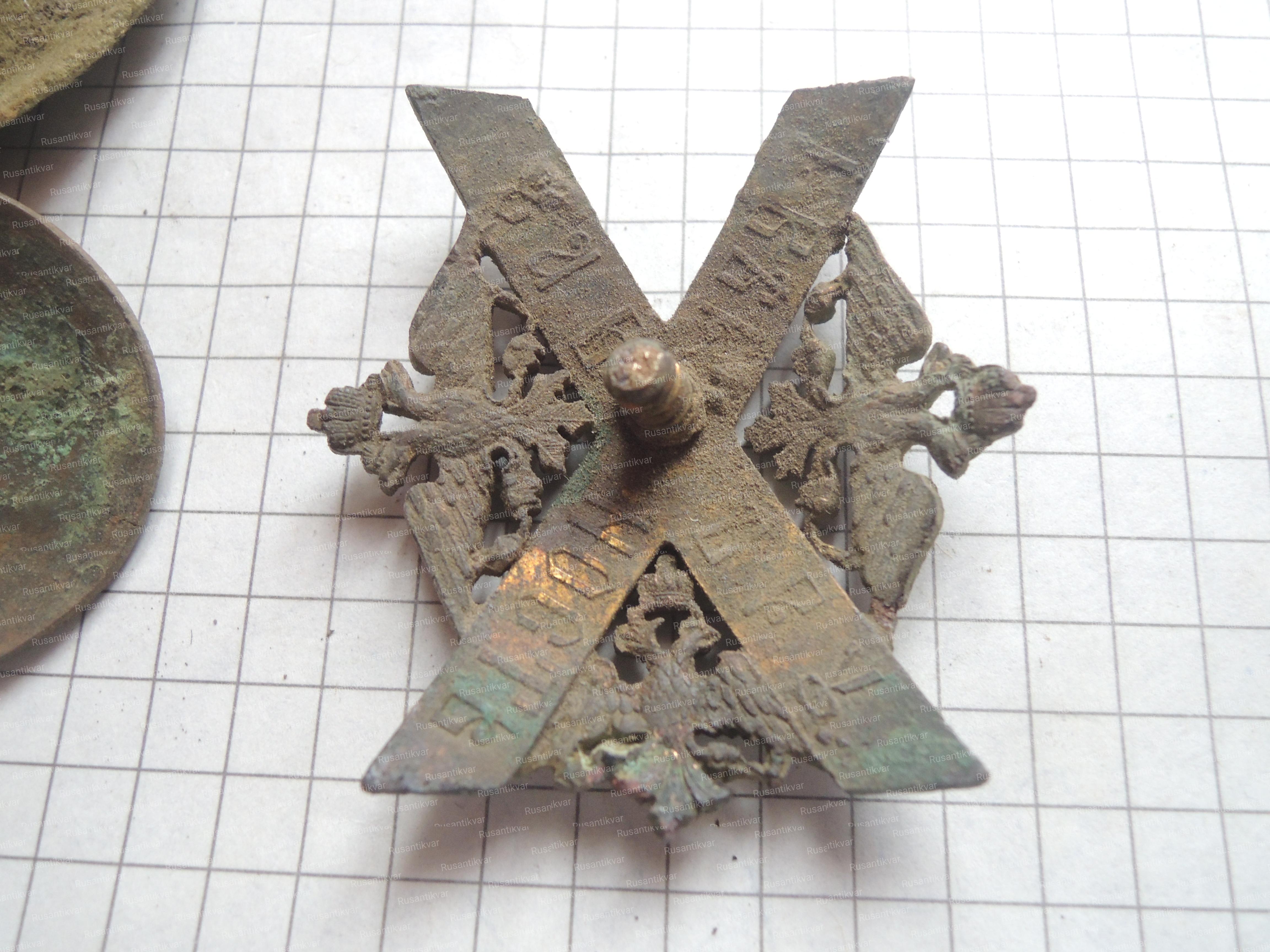 Вот полковой знак первого полка Императорской Гвардии Преображенский полк, как видно по сохранившемуся куску от защитного мундира корона была отломана специально.
