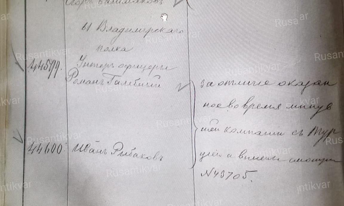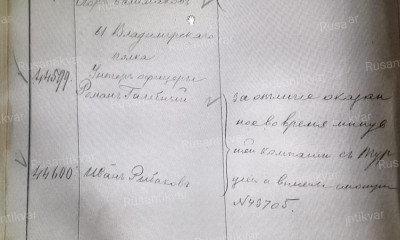 Знаком Отличия 4 ст за номером 42.861 награждён Хлюстов Андрей, 156 пехотный Елизаветпольский полк, рядовой. За отличия в делах с турками 4 - 5 мая 1877 г при взятии Ардагана.