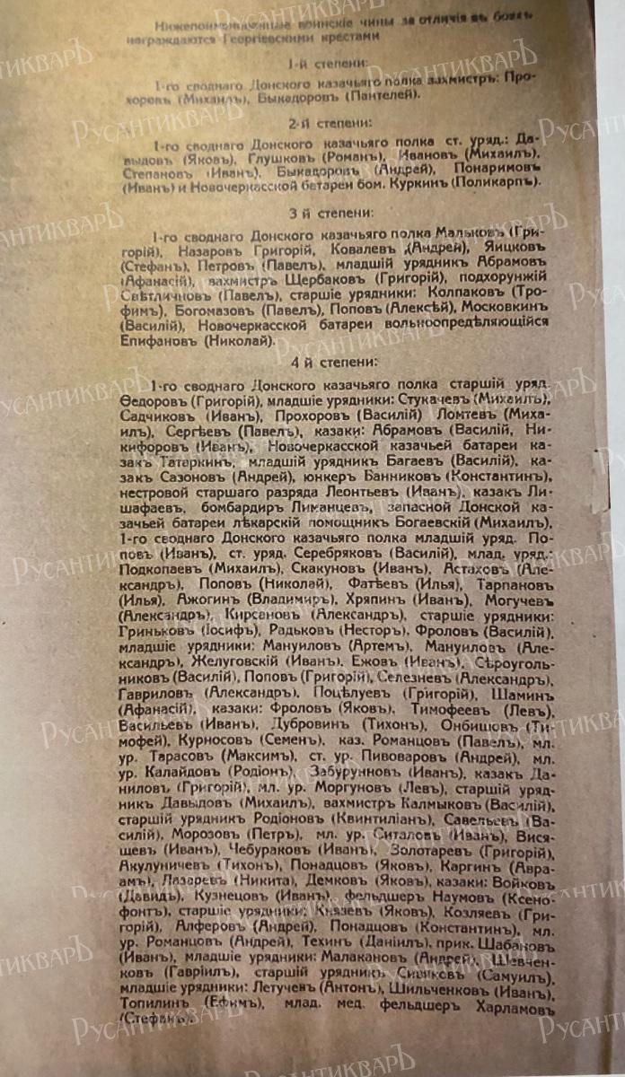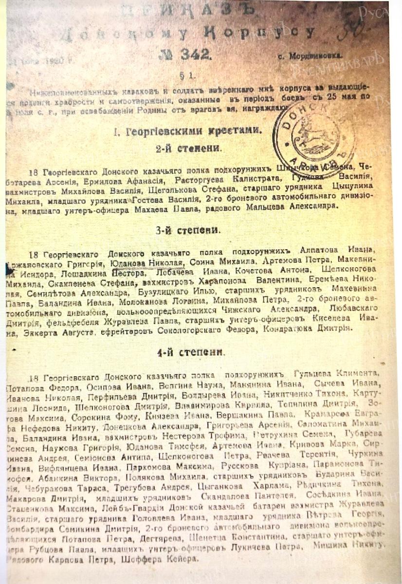 Приказом по Донскому корпусу N 264 от14 июня 1920 года был подтвержден порядок награждения воинских чинов Георгиевскими крестами 2,3 и 4-й степеней и Георгиевскими медалями всех степеней "За отличия в боях",властью командира Корпуса.