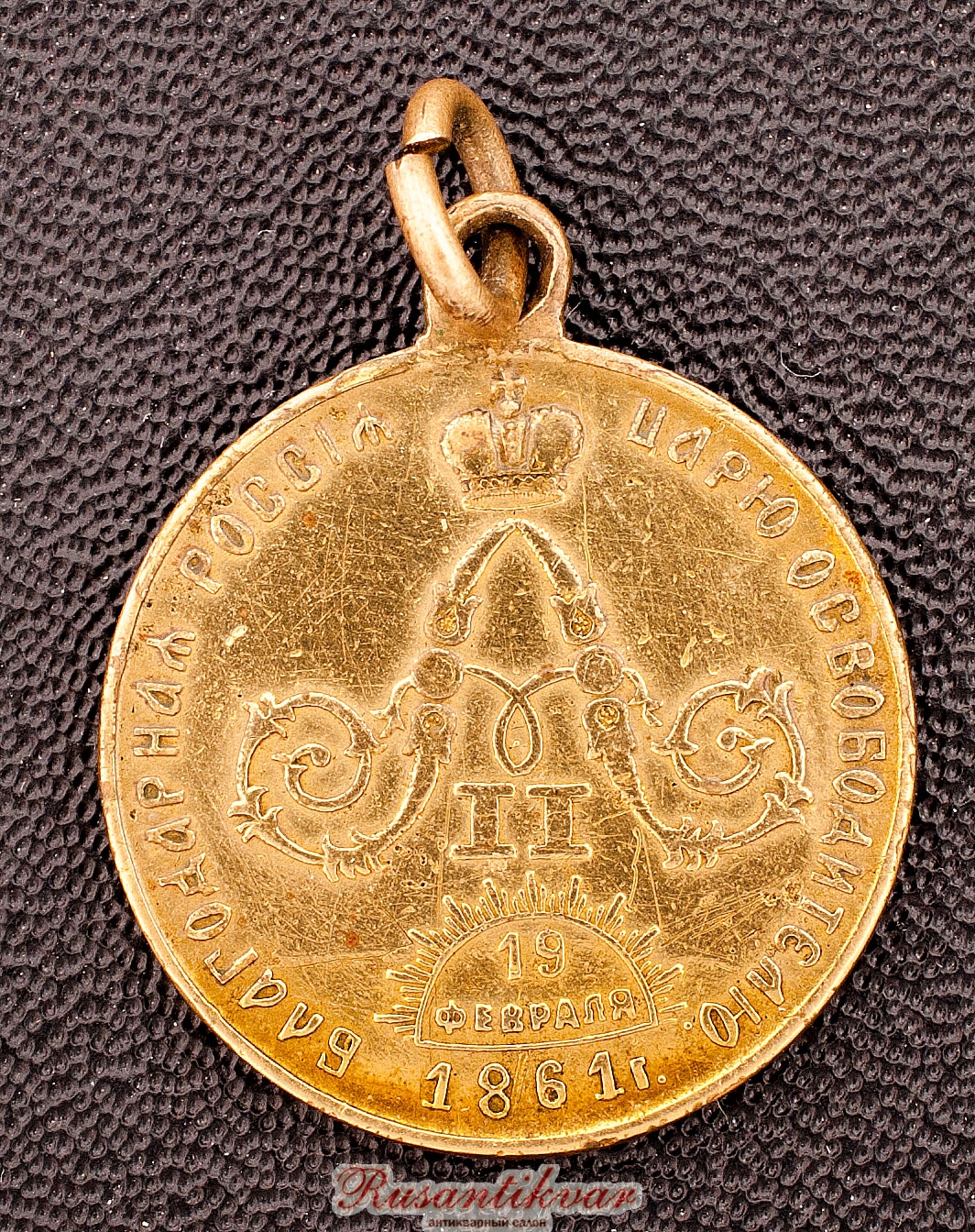Аверс: В центре вензель Александра II под императорской короной. Под ним изображение восходящего солнца и надпись на нем: 19 ФЕВРАЛЯ 1861 г. По кругу вдоль борта медали надпись: "БЛАГОДАРНАЯ РОССИЯ ЦАРЮ ОСВОБОДИТЕЛЮ."