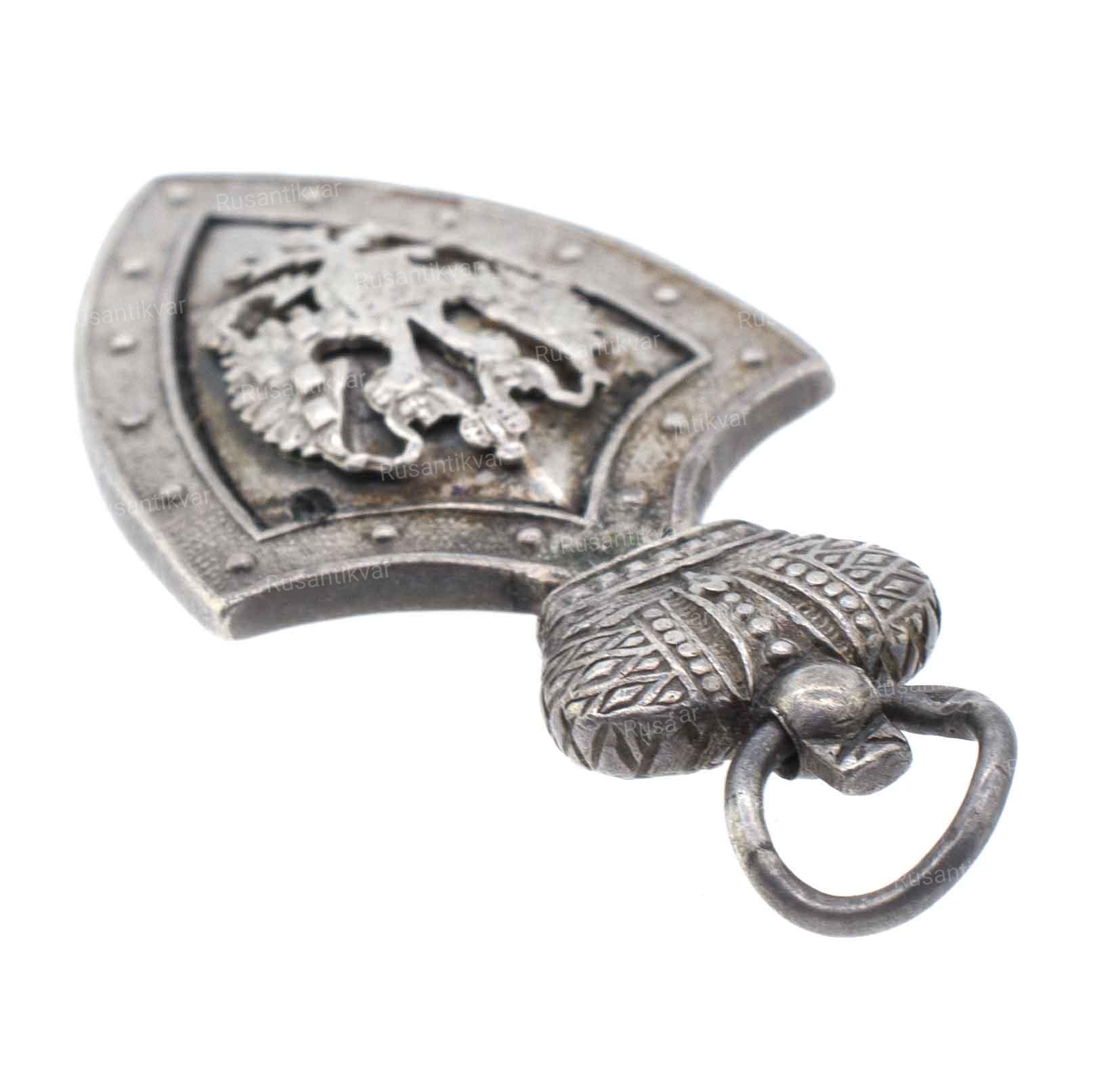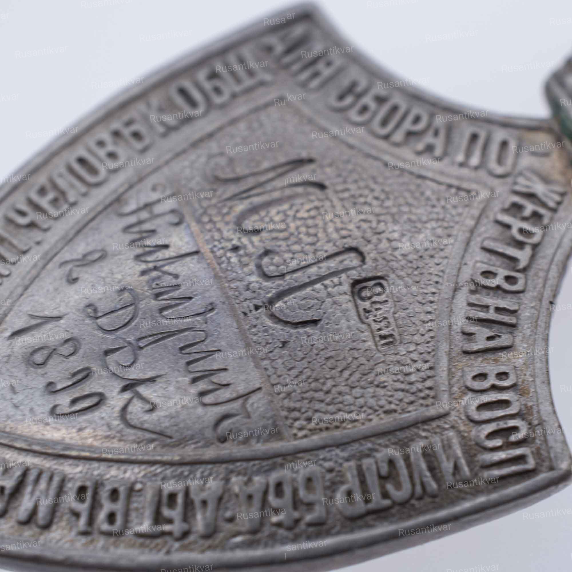 Жетон Попечительства Императорского Человеколюбивого общества для сбора пожертвований на воспитание и устройство бедных детей в мастерство. С.-Петербург, 1899 г. Фирма «Эдуард». Клейма: на об. ст. жетона вверху — проба металла с инициалами управляющего СПб пробирным округом Я.Н.Ляпунова «84 ЯЛ»; на соединительном кольце — именное клеймо «ЭД». Серебро, 11,5 г. Размеры 41×21,4 мм. Сохранность близкая к превосходной. Аналоги см. Грибанов# 149. Иванов# 117. Гравировка на об. ст. жетона в четыре строки: «М.Л. / Никирин / 2 Дек. / 1899».