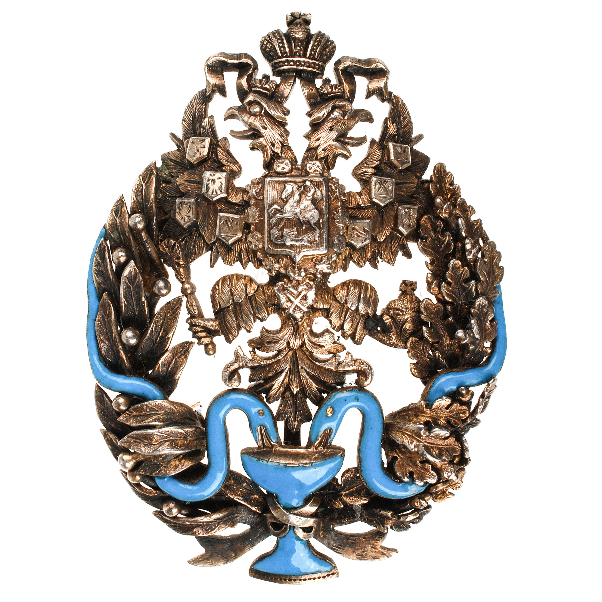 Знак врача, имеющего звание лекаря. Российская Империя, начало XX в. Неизвестная мастерская. Бронза, эмаль, позолота. Размеры 54,7×41,3 мм.