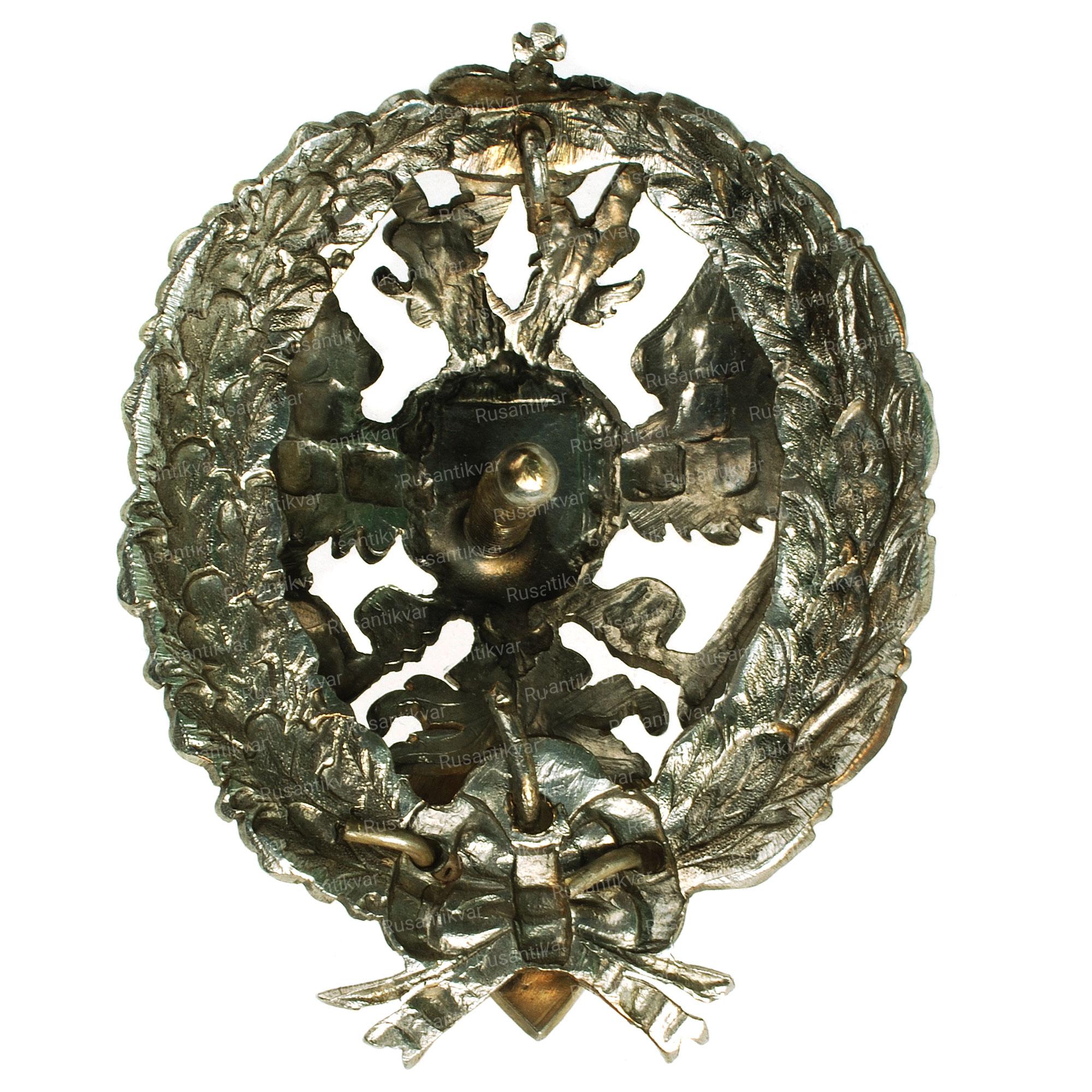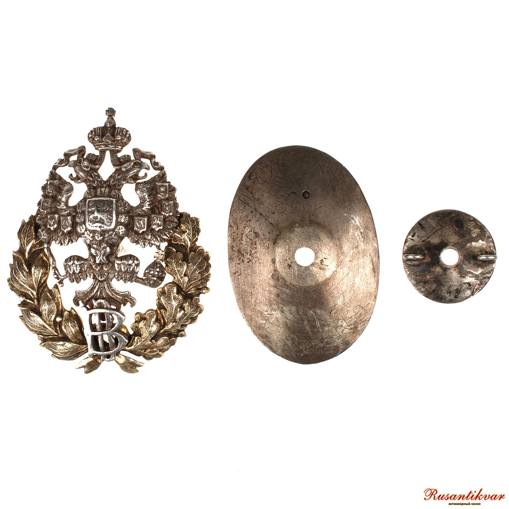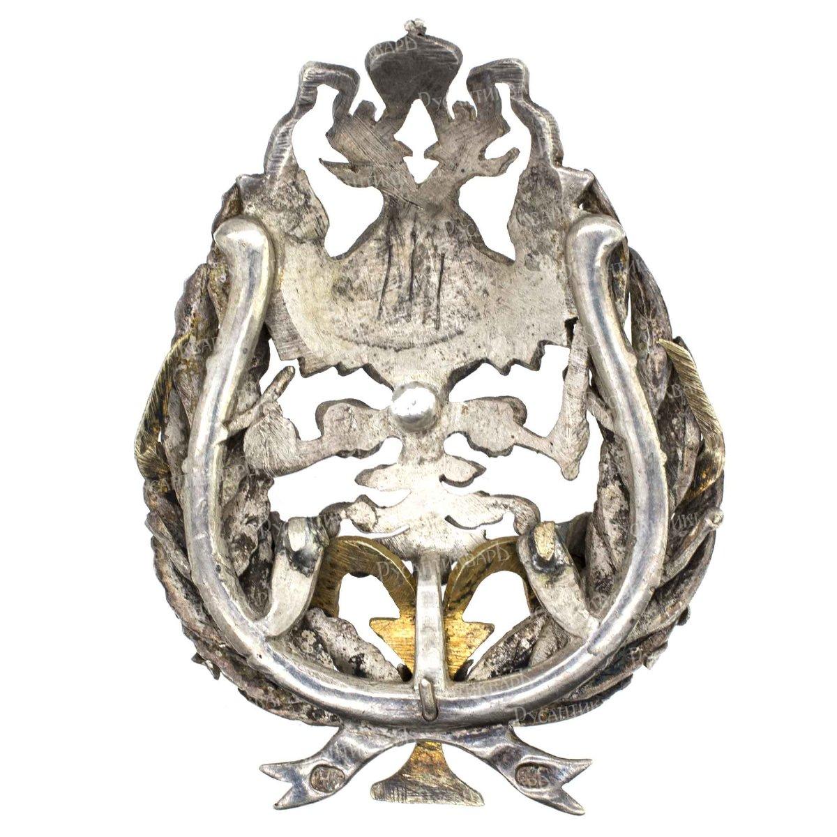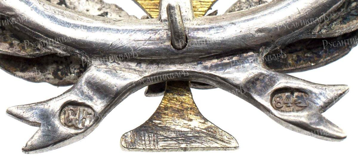 Фирма Дмитрия Осипова. Клейма: на знаке – пробирное «84» и «герб Санкт-Петербурга», именное «Д.О», на прижимной шайбе – именное «ДО», пробирное «84» и «герб Санкт-Петербурга». Серебро, позолота, эмаль. Размер 60,2×43,5 мм. Вес 30,65 г.