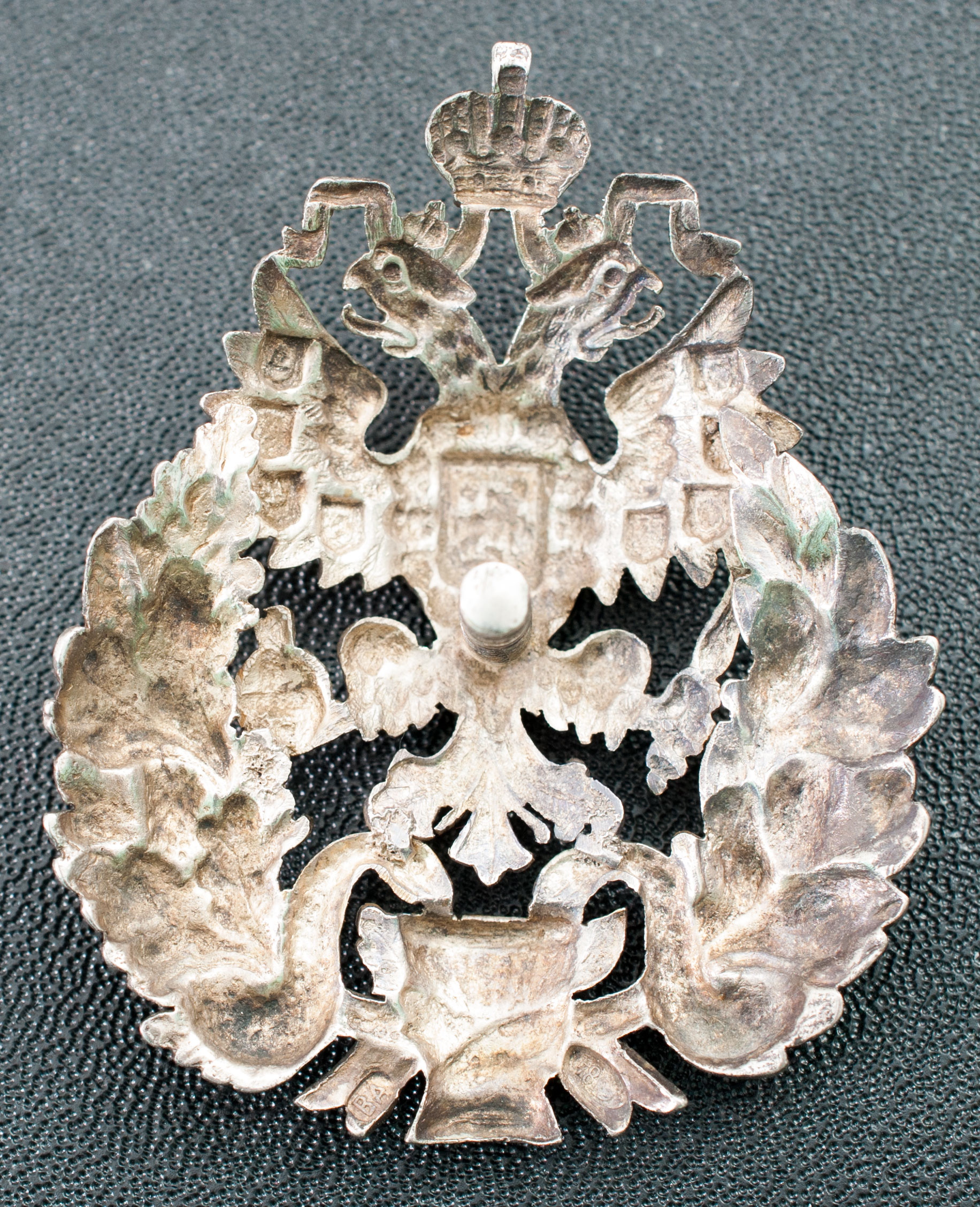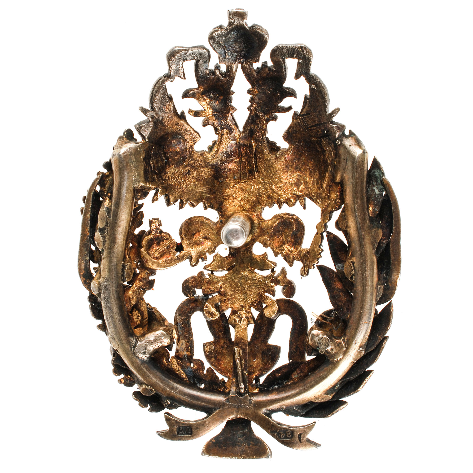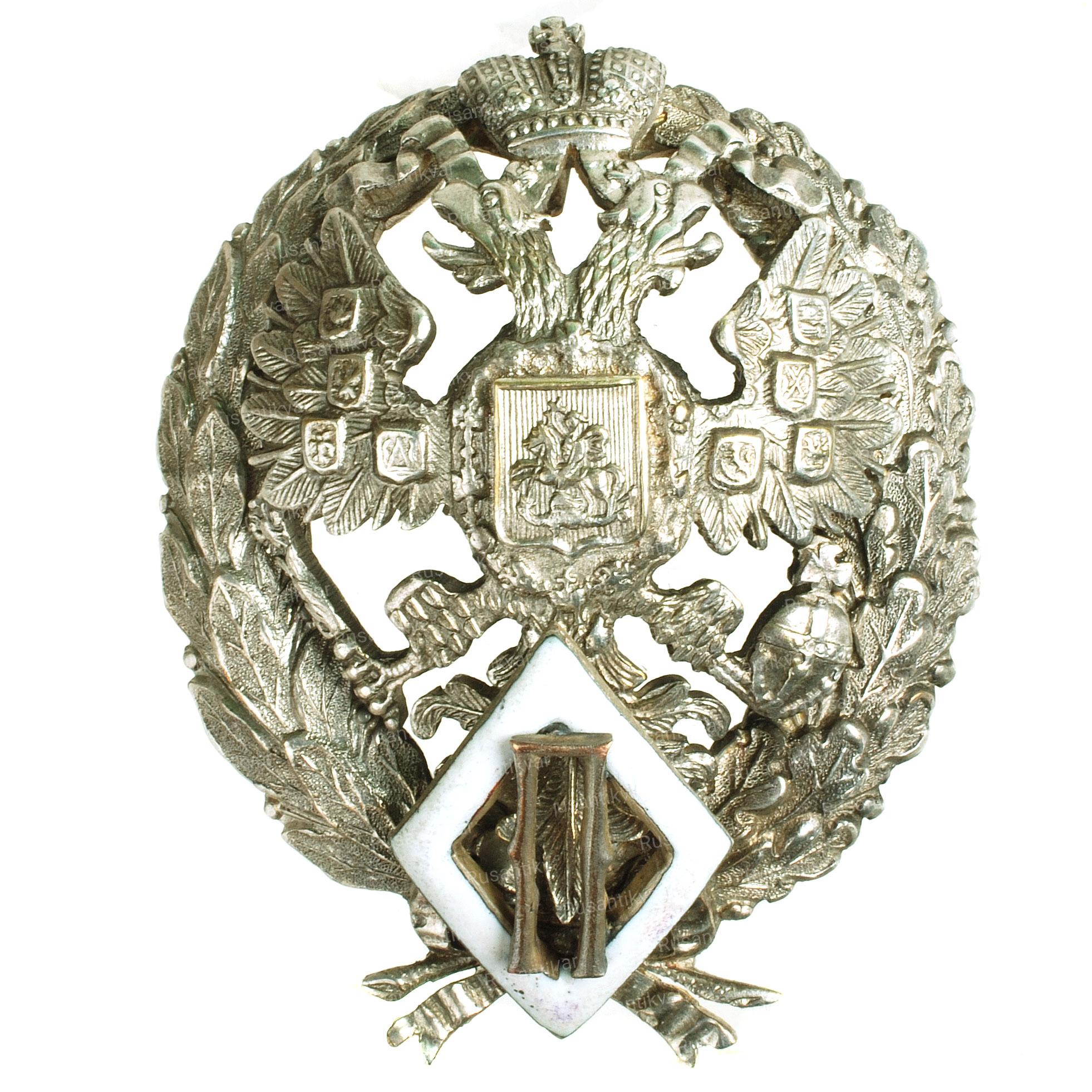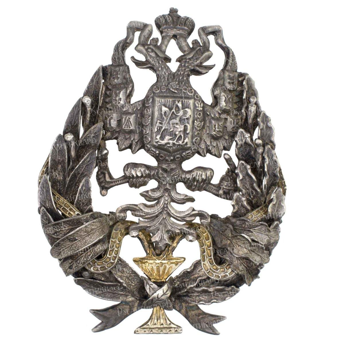 Фирма Дмитрия Осипова. Клейма: на знаке – пробирное «84» и «герб Санкт-Петербурга», именное «Д.О», на прижимной шайбе – именное «ДО», пробирное «84» и «герб Санкт-Петербурга». Серебро, позолота, эмаль. Размер 60,2×43,5 мм. Вес 30,65 г.