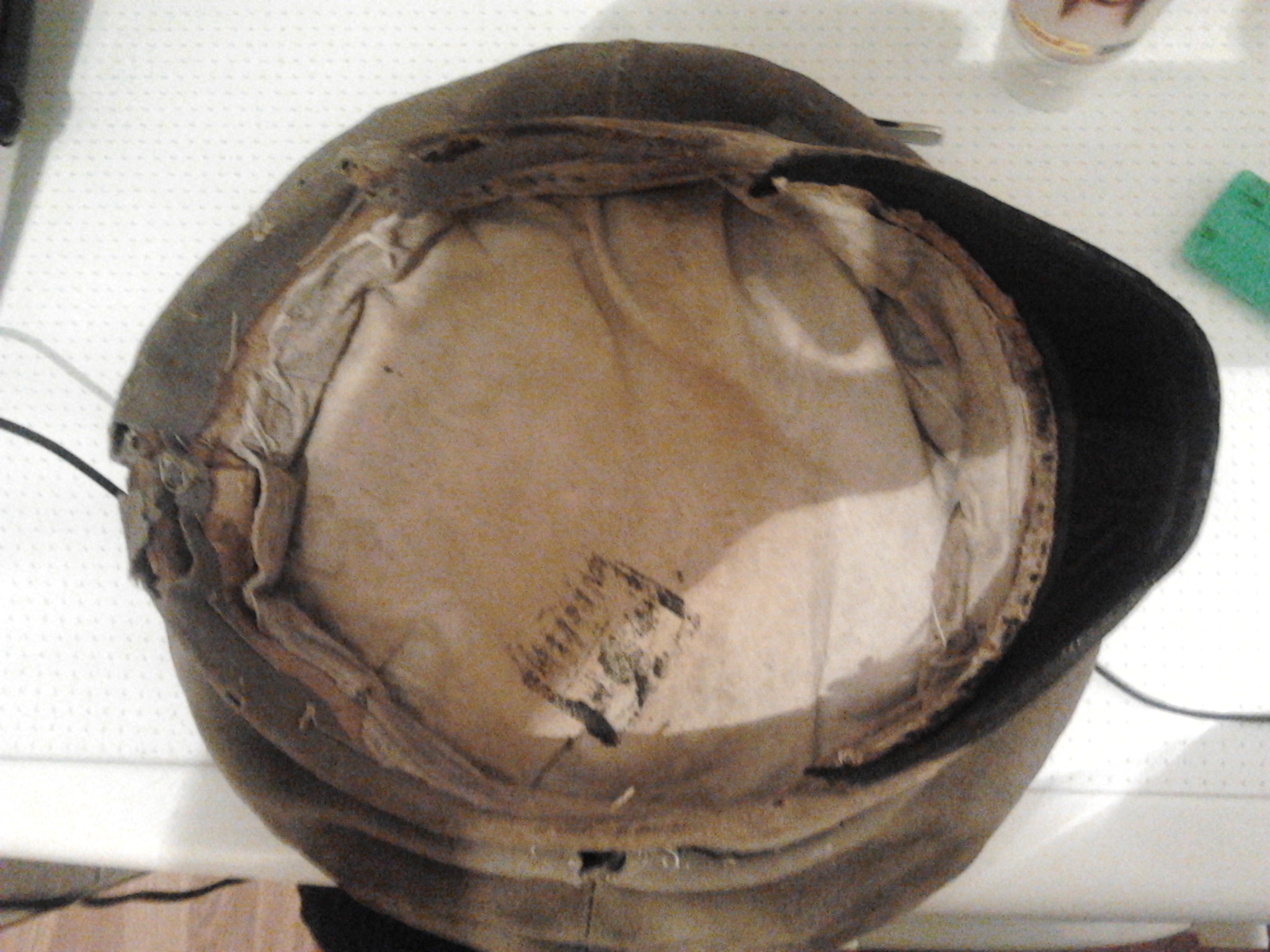 козырек изготовлен из кожи и покрыт маслянной краской защитного цвета.