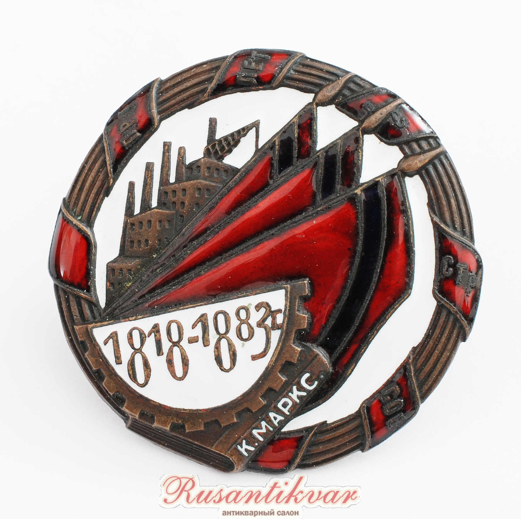 Знак "Пятидесятилетие со дня смерти К.Маркса".Изготовлен по заказу трудового коллектива Ленинградского завода им."Карла Маркса" 14 марта 1933 г.На торжественно-траурном заседании в концертном зале Выборгского дома культуры знаки вручили лучшим производственникам предприятия.Каждый награжденный получил вместе со знаком и специальное удостоверение.