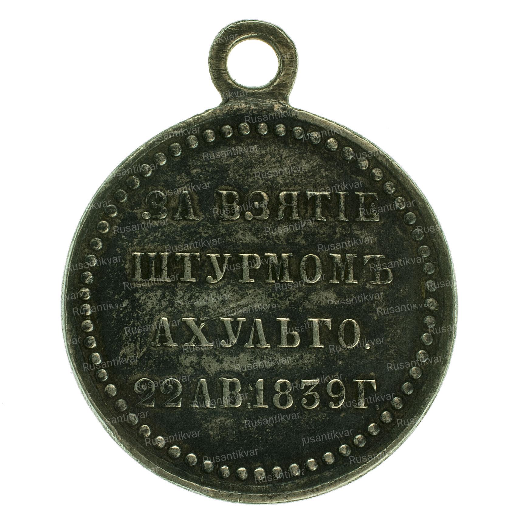Медаль учреждена 5 сентября 1839 года "высочайшим" приказом Императора Николая 1,данным военному министру А.И.Чернышеву.Медалью награждали участников штурма дагестанского аула Ахульго 22 августа 1839 года. Медаль носилась на груди на ленте ордена Св.Георгия.