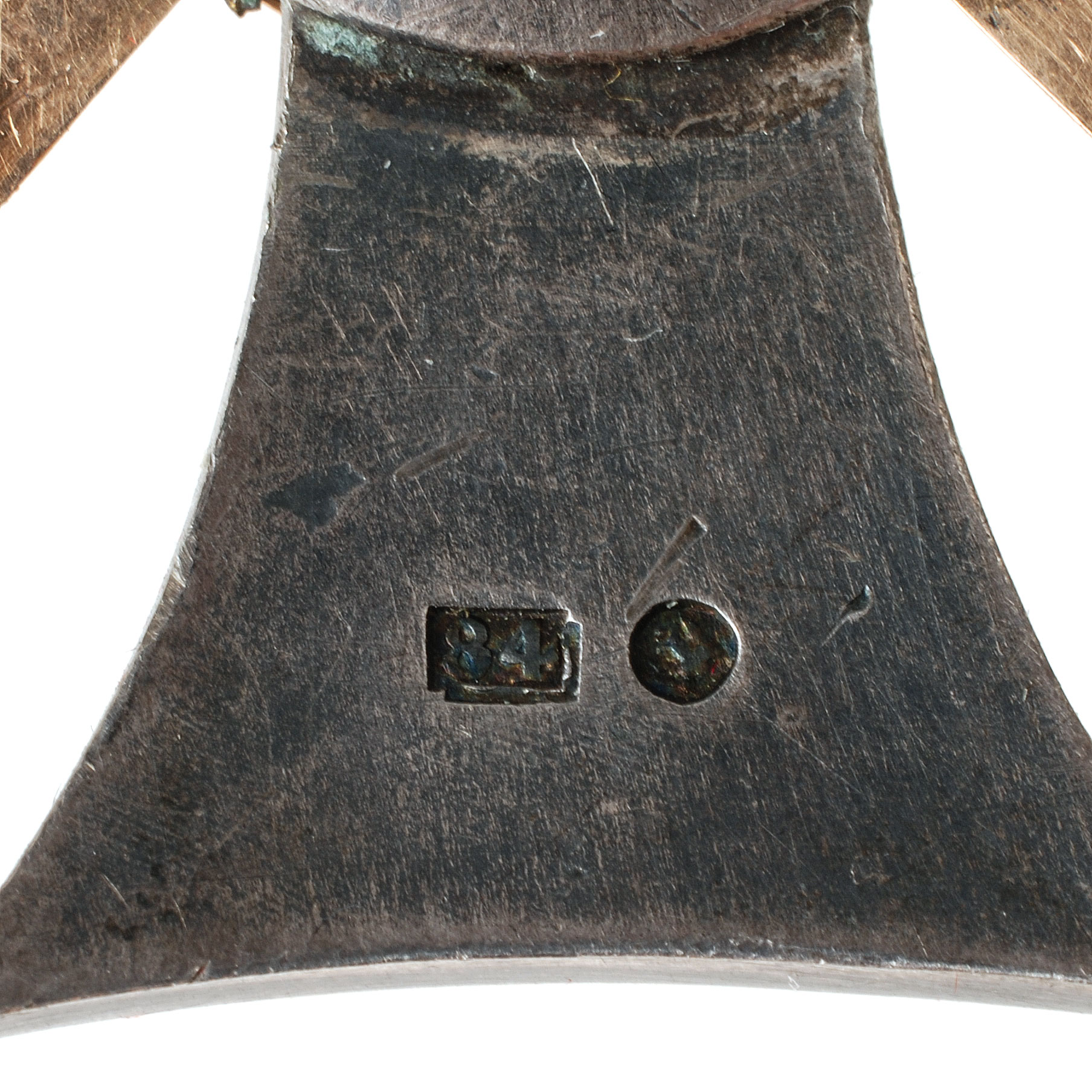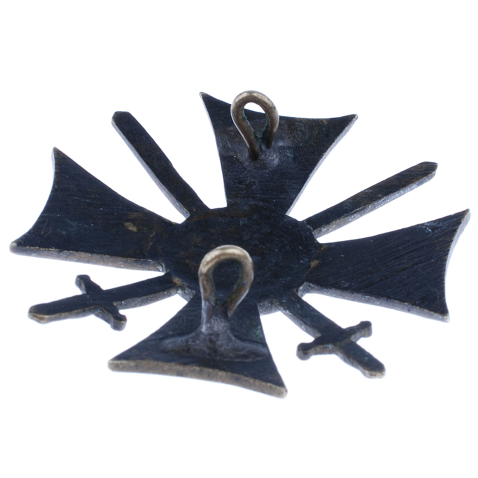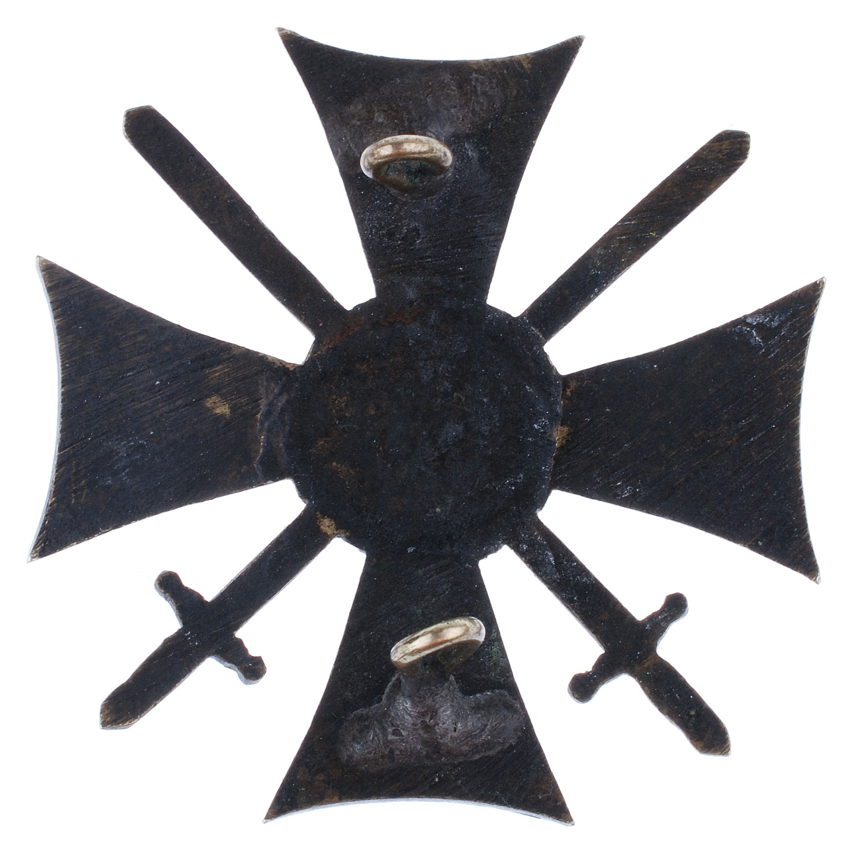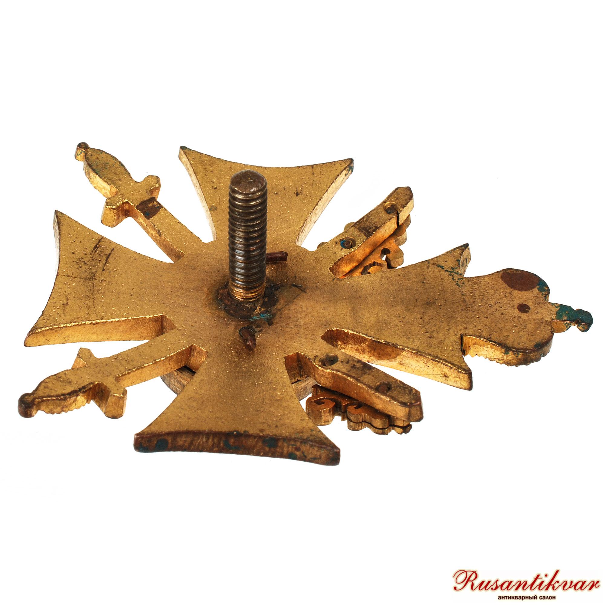 А вообще это один из самых сложных по конструкции наград Российской империи. Сам силуэт креста чеканился из цельной серебряной заготовки. Два перекрещенных меча накладывались на крест, и поверх них крепилась золотая или позолоченная розетка (круглый щит) с изображением российского двуглавого орла. Отдельно изготовленные позолоченные буквы надписи, цифры года и вензель с короной крепились уже после основной сборки.