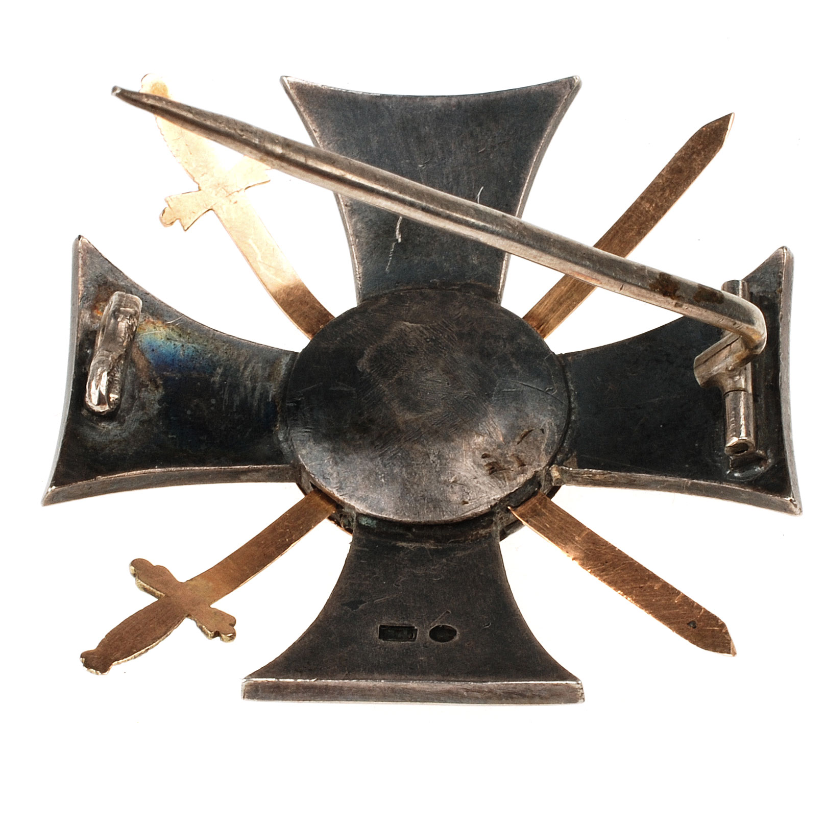 А вообще это один из самых сложных по конструкции наград Российской империи. Сам силуэт креста чеканился из цельной серебряной заготовки. Два перекрещенных меча накладывались на крест, и поверх них крепилась золотая или позолоченная розетка (круглый щит) с изображением российского двуглавого орла. Отдельно изготовленные позолоченные буквы надписи, цифры года и вензель с короной крепились уже после основной сборки.